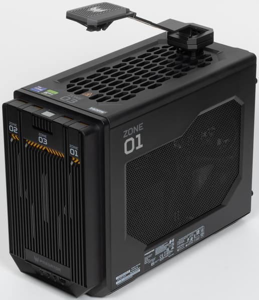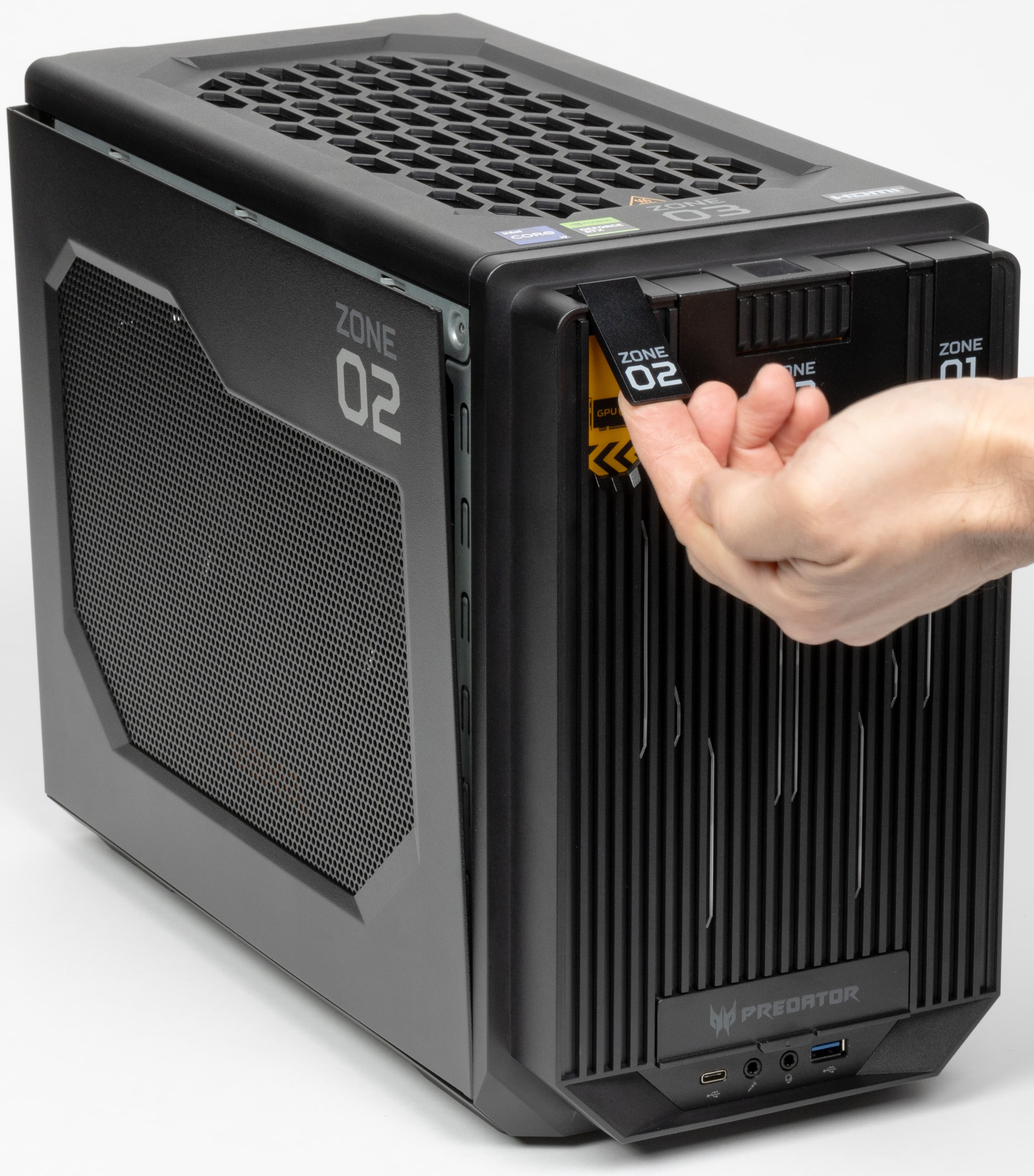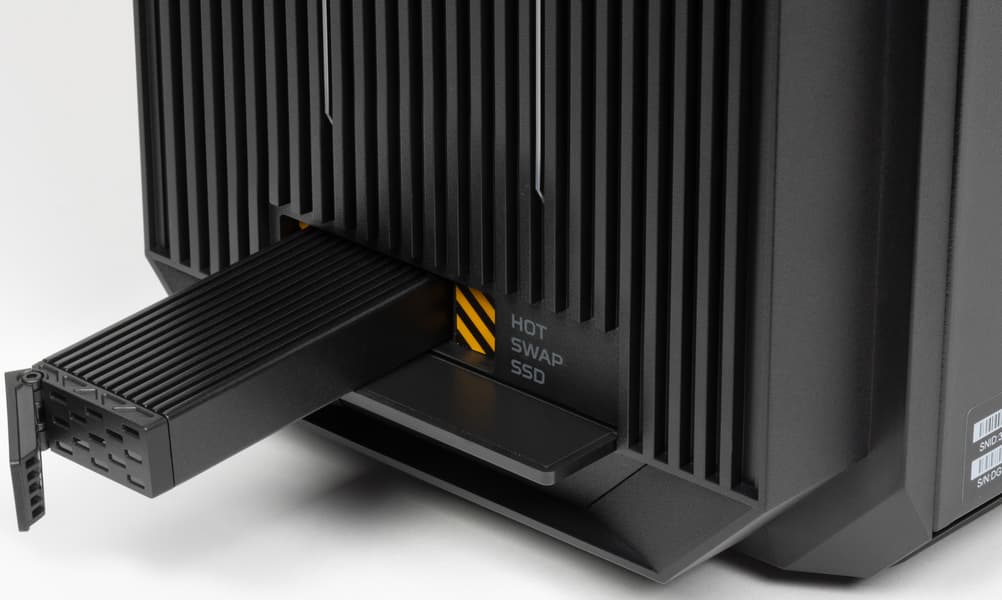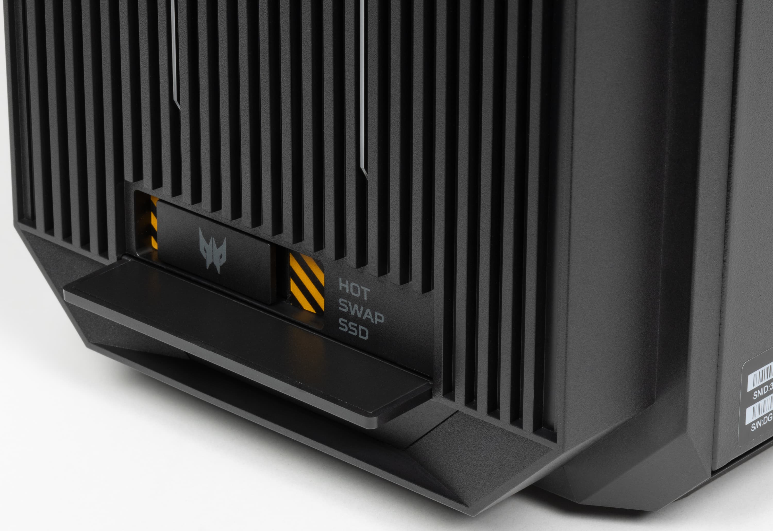 А теперь после всех дифирамбов повторим: это слабое место всех линеек Acer Predator Orion, поскольку емкость системных SSD одинакова для любых компьютеров семейства и составляет 1 ТБ. С учетом аппетитов современных игр (который вряд ли удастся обуздать в ближайшие годы) такое странновато выглядит даже в компьютерах за сотню-другую тысяч рублей, а стоимость Orion X начинается конкретно так за три сотни тысяч и доходит до пяти, поэтому в нем такая емкость SSD просто несерьезна. К тому же «основной» накопитель «прячется» под располагаемым вторым этажом дополнительным, так что его еще и менять сложновато. Проще всего добавить на дополнительное место что-нибудь на 2—4 ТБ. А вообще логично было бы ставить хотя бы в старшие модели по паре таких SSD (раз уж Acer более емких, видимо, не закупает — в ОЕМ-сегменте это дело обычное), что на цене практически не сказалось бы, но пары терабайт многим уже было бы достаточно. А если бы кто-то всё равно сразу добавлял собственный накопитель, то оказался бы куда более востребованным съемный блок, чтобы превратить один из двух штатных SSD во внешний. По слухам, на некоторых рынках компания так и делает — однако наш к ним не относится, к сожалению. Так или иначе, до единственного штатного SSD здесь добираться сложновато, что ставит под удар всю заботу о покупателе, тем более что для долгой и счастливой жизни его одного всё равно мало.