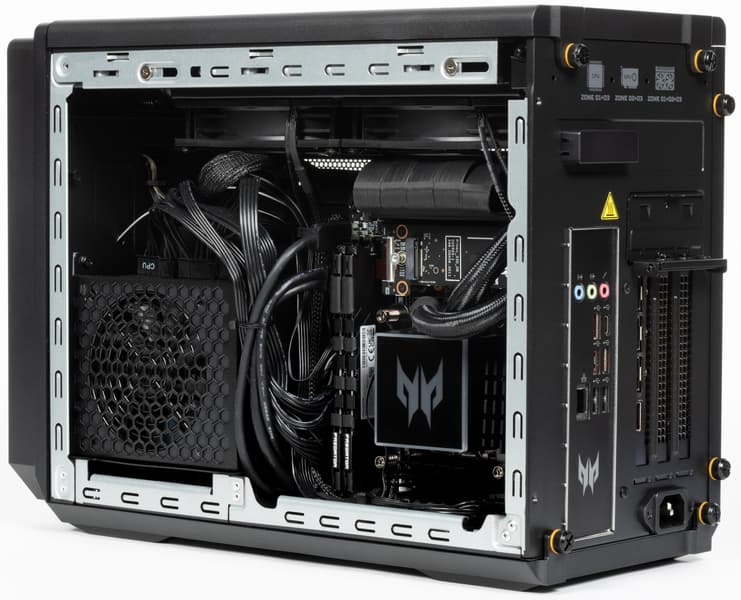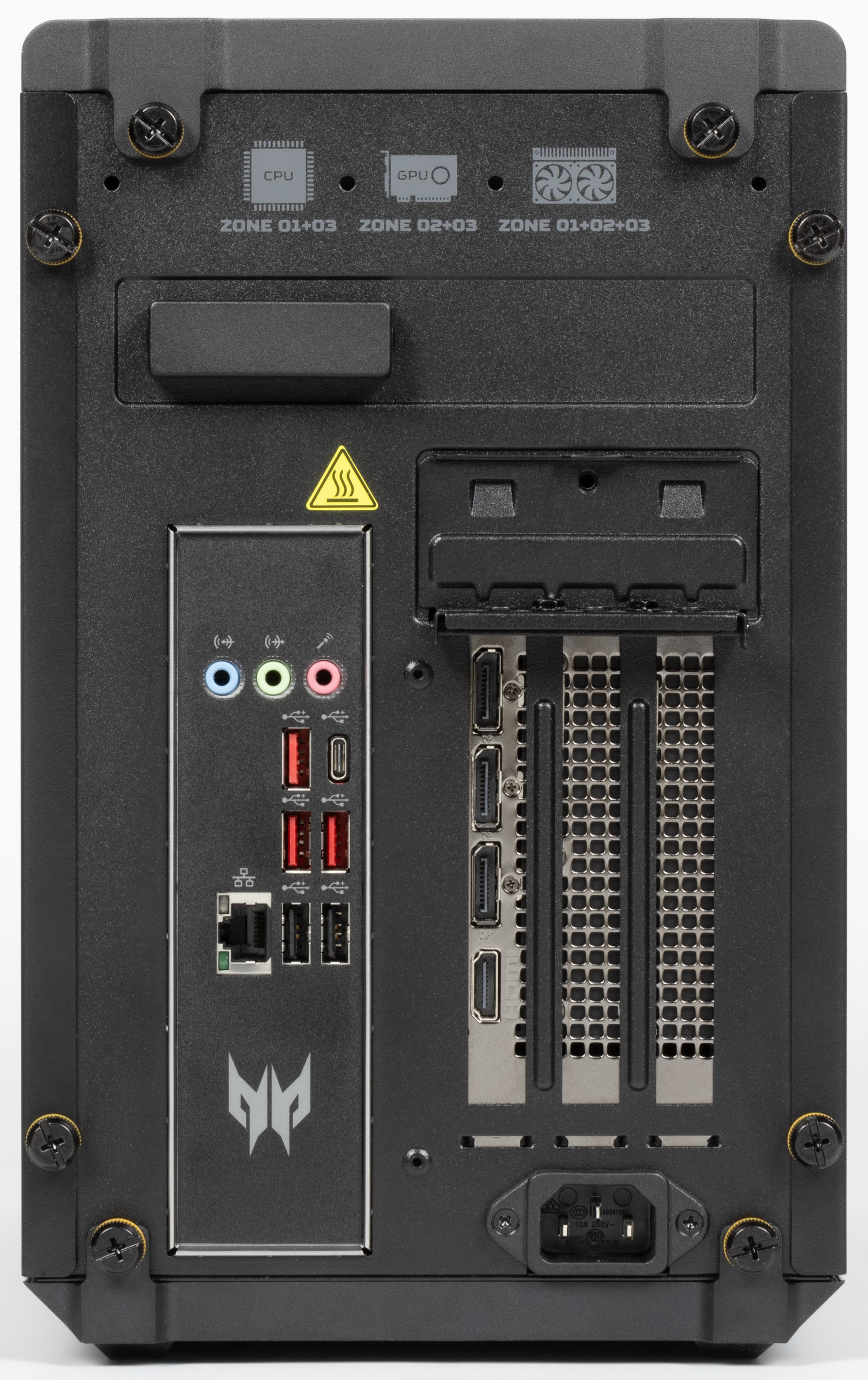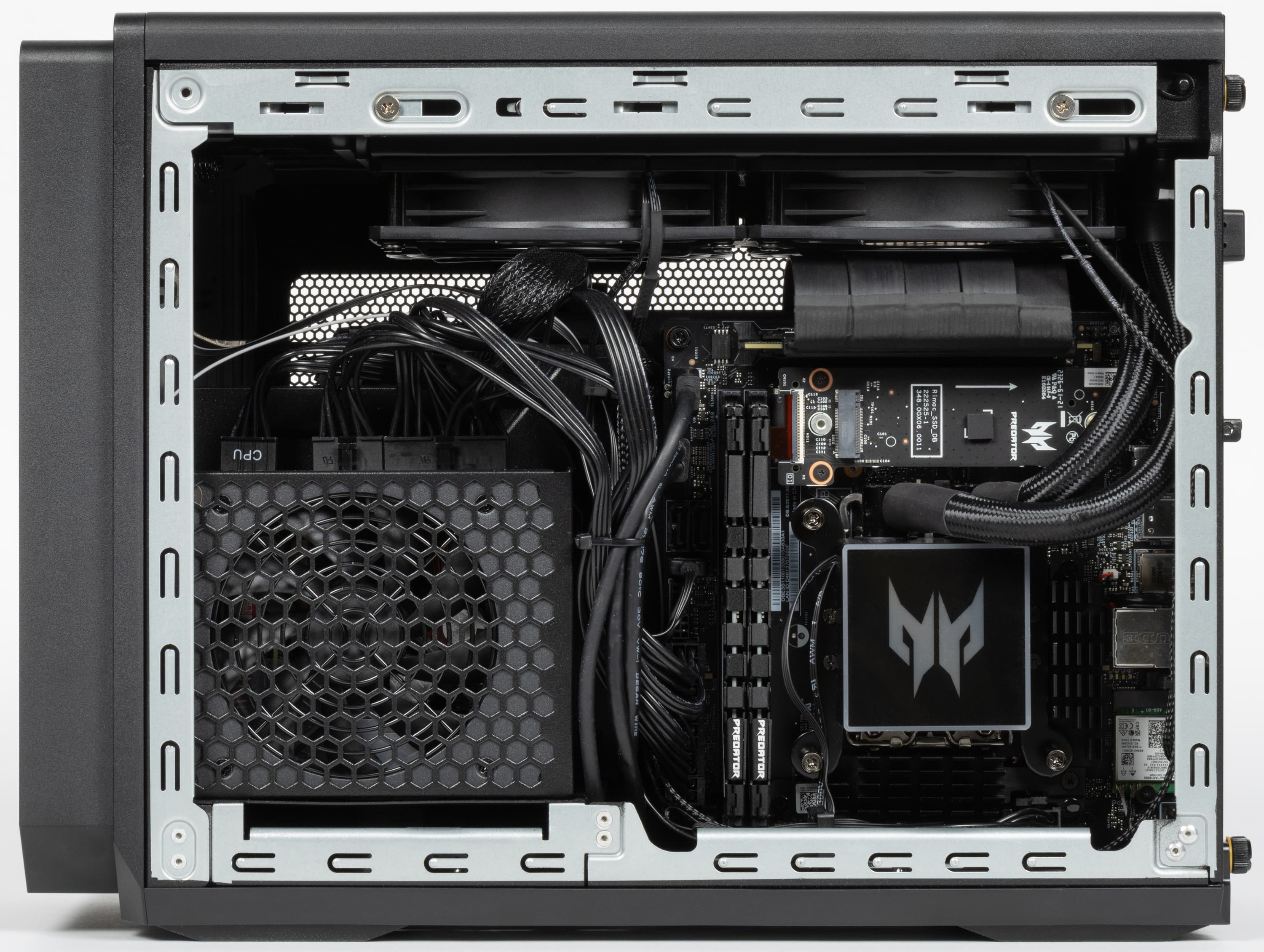 Кто у нас в первую очередь занимается решением поставленной задачи? Процессор Intel Core i9-13900KF с 32 ГБ памяти DDR5 и, главное, видеокарта GeForce RTX 4090. Последняя по-прежнему альтернатив в своем классе не имеет, а процессор формально лишь предпоследнего поколения, но Core i9-14900KF от него фактически ничем не отличается. Поклонники AMD предпочли бы Ryzen 9 7950X3D, но это вопрос уже во многом религиозный. Тем паче, что во многих играх Core i9-13900KF таки быстрее (насколько это вообще имеет значение — учитывая, что процессоры в играх в любом случае герои второго плана), а тут речь о топовой игровой системе. Но, в общем, углубляться в эту тему нет смысла, поскольку в Acer Predator используются платформы Intel. Кому нужны другие — придется присматривать что-то другое.