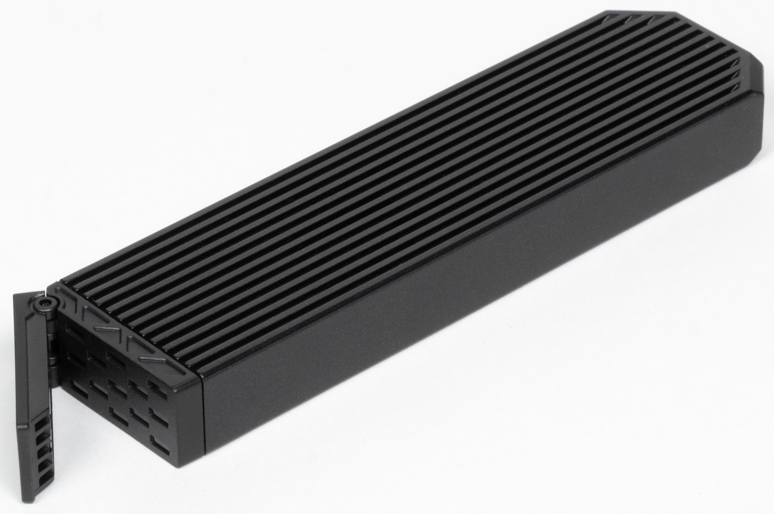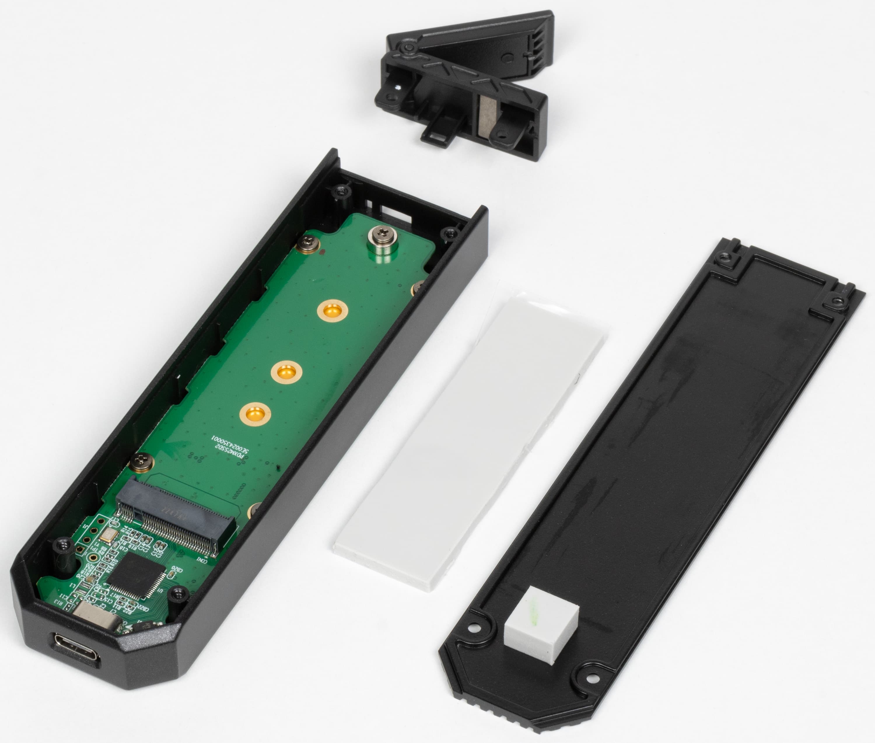 ...и вытащить комплектный корпус под NVMe-накопители формата М.2 2280. Основан он на давно знакомом нам мосте USB—NVMe JMicron JMS583, так что поддерживает скоростные режимы вплоть до «десятигигабитного» Gen2. Именно такой порт в глубине дока и расположен, а к другим компьютерам его можно подключать при помощи кабелей C—C или А—С.