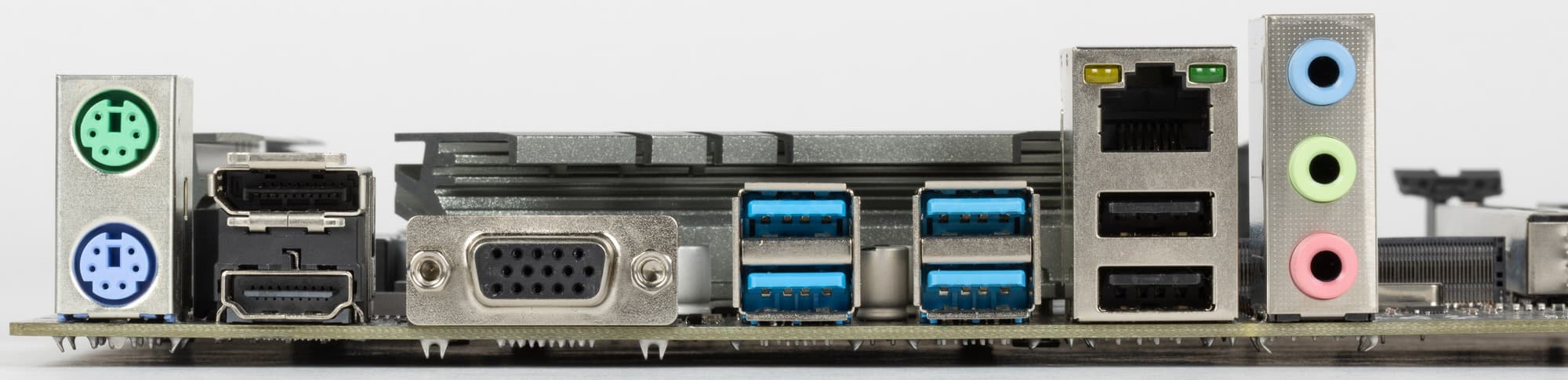 | Разъемы на задней панели | 4 × USB 3.2 Gen1 (Type-A) 2 × USB 2.0 (Type-A) 1 × RJ-45 3 аудиоразъемa типа миниджек 2 разъема PS/2 для клавиатуры и мыши 1 разъем HDMI out 1 разъем Display Port out 1 разъем d-Sub (VGA) out |