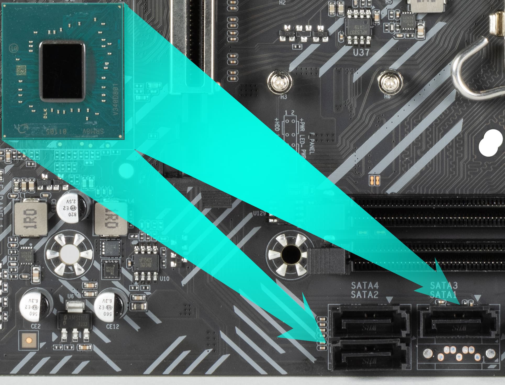 Порты SATA реализованы через чипсет B760 и поддерживают создание RAID. Размещены в вертикальной ориентации.