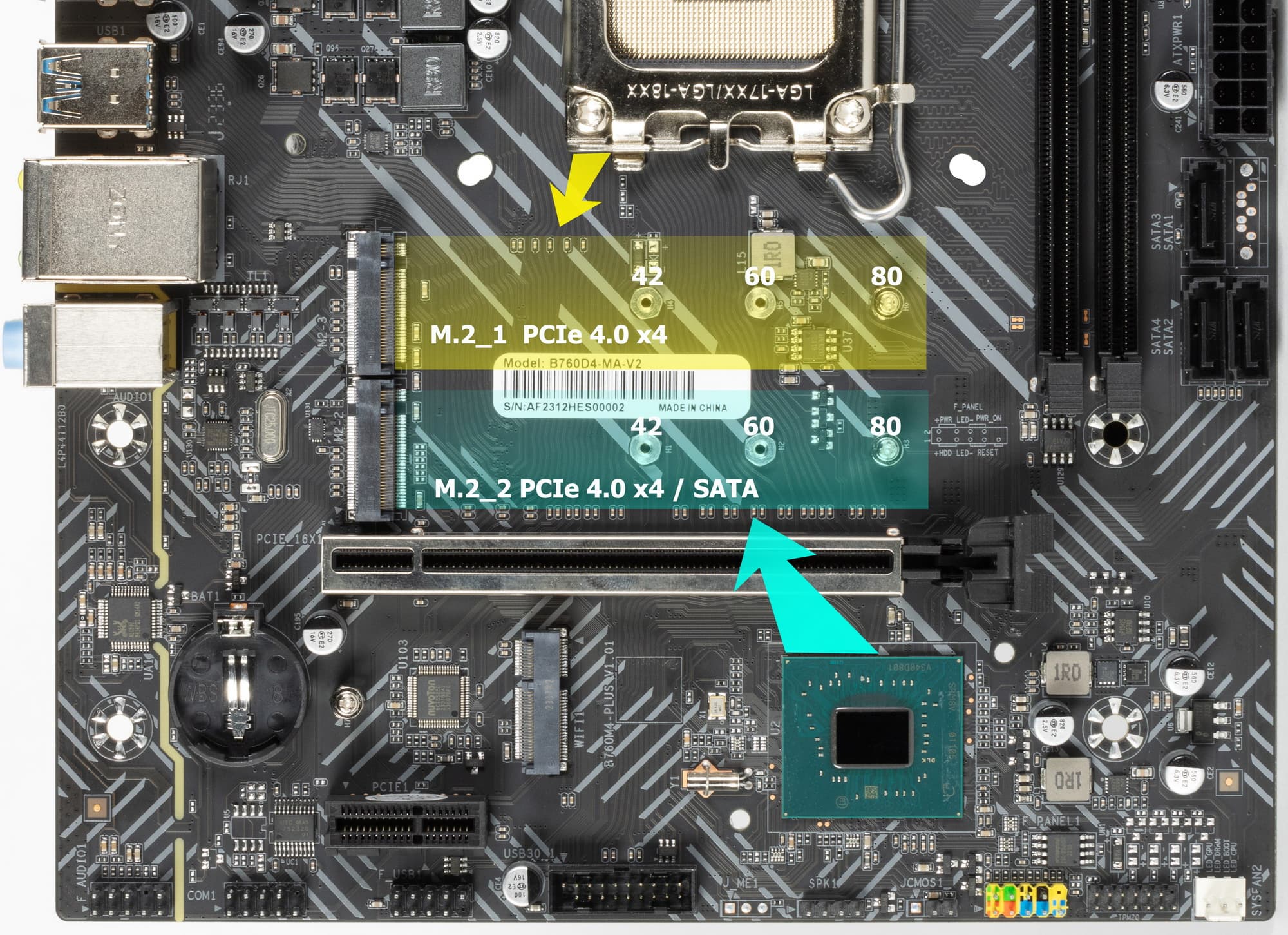 Первый M.2_1 получает данные от CPU (PCIe 4.0), работает с модулями только с PCIe интерфейсом и поддерживает размеры модулей 2242/2260/2280. Второй M.2_2 получает данные от B760 (PCIe 4.0), работает с модулями c любым интерфейсом и также поддерживает размеры модулей 2242/2260/2280.