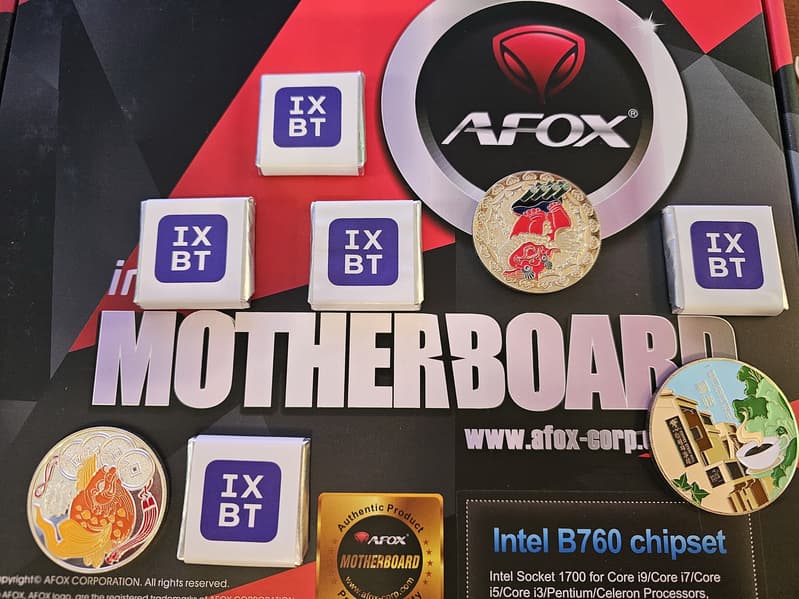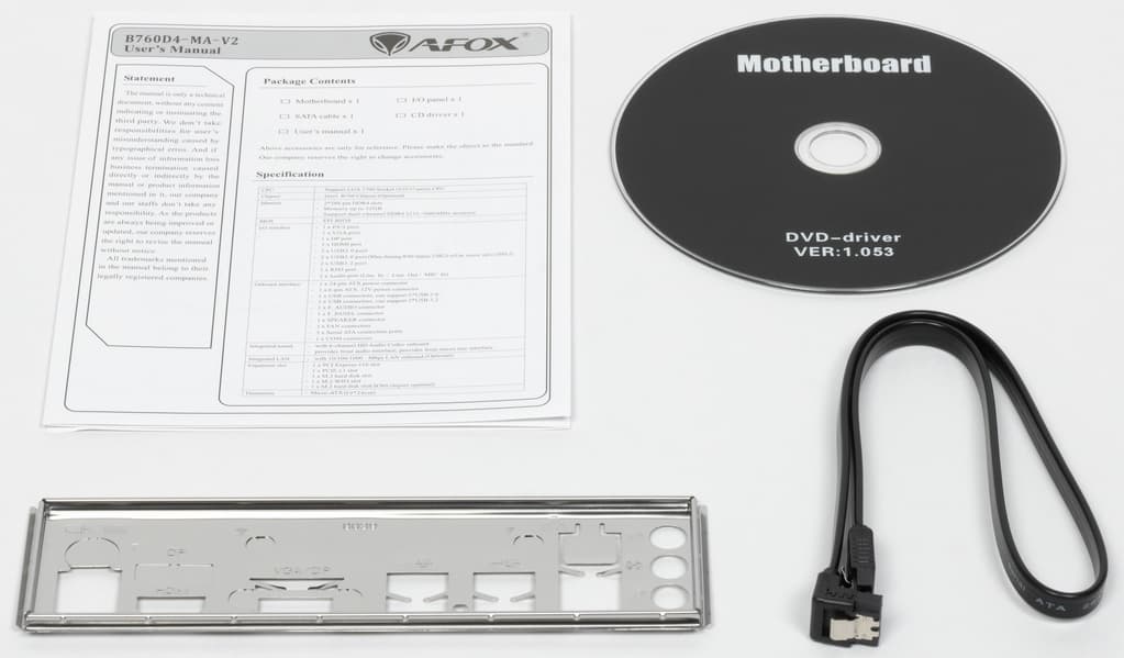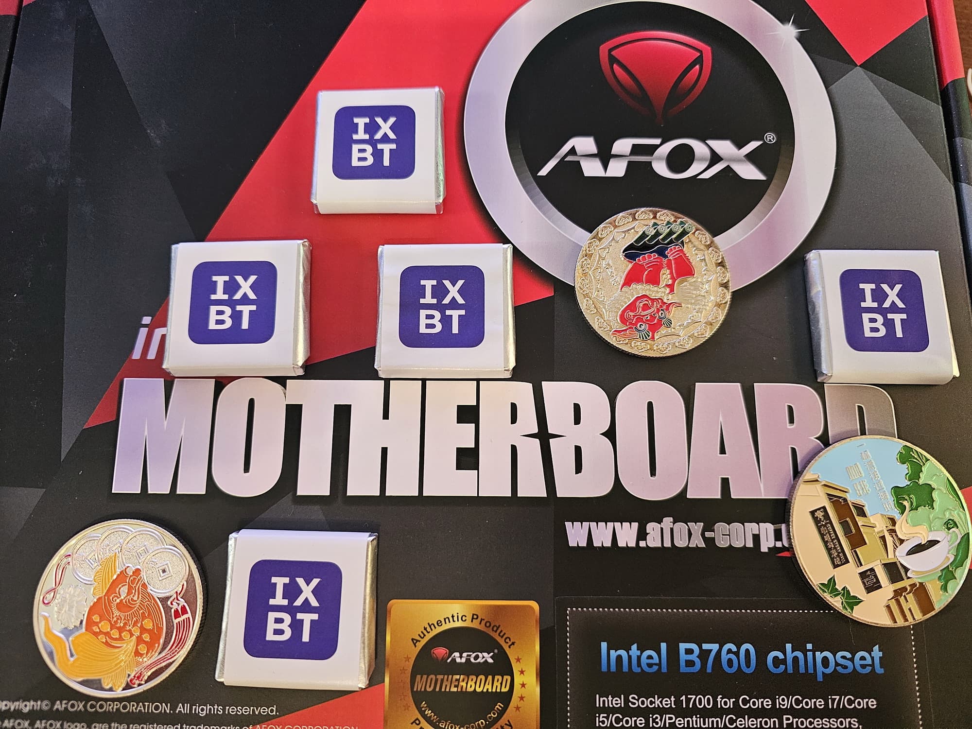 Afox B760D4-MA-V2 поставляется в стандартной коробке фирменного дизайна Afox. Комплект размещен сбоку от платы в отдельном отсеке.