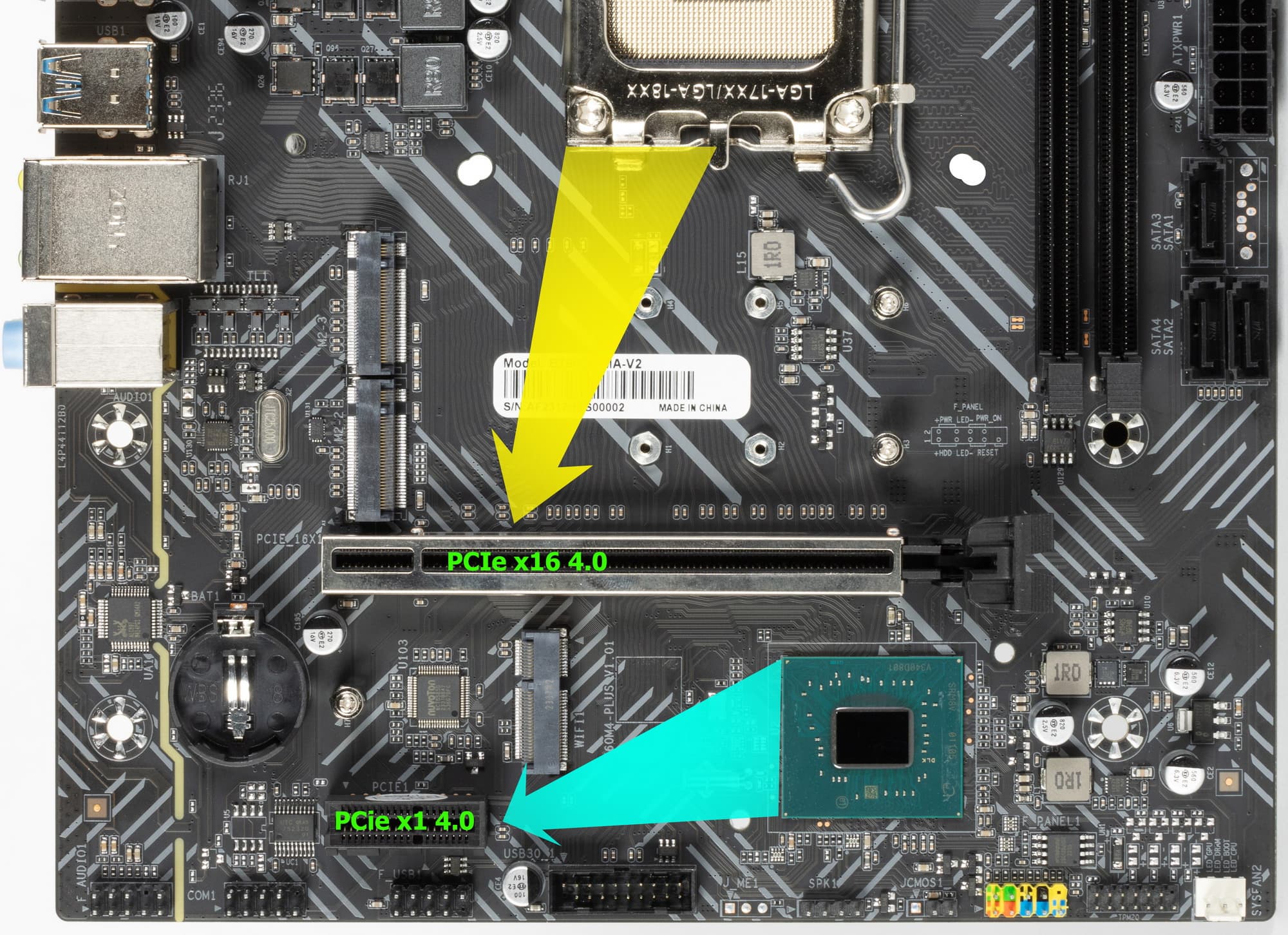 Теперь в целом про слоты PCIe. Всего на плате есть 2 слота: один PCIe x16 (для видеокарт или других устройств) и один PCIe x1. Если про первый PCIe x16_1 я выше уже рассказал (он подключен к CPU), то PCIe x1 подключен к B760.