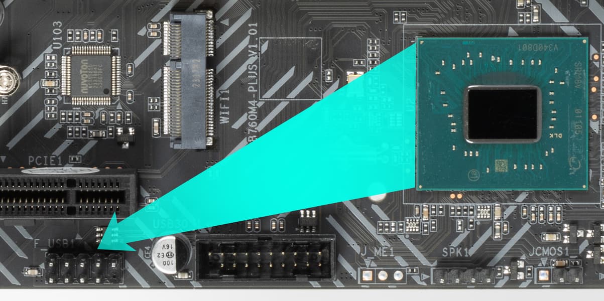 Процессоры Intel Core 12/13/14-го поколений (совместимые с сокетом LGA1700 и поддерживаемые B760) имеют 20 линий ввода-вывода (16 PCIe 5.0, 4 PCIe 4.0), не имеют USB и SATA портов. При этом взаимодействие с B760 идет по особому каналу Digital Media Interface 4.0 (DMI 4.0 x4 (именно х4!)). Все PCIe линии процессора идут на слоты расширения PCIe и порт М.2. Serial Peripheral Interface (SPI) используется для взаимодействия с системой UEFI/BIOS, а шина Low Pin Count (LPC) — для связи с устройствами ввода/вывода, не требующими высокой пропускной способности (контроллерами вентиляторов, TPM, старой периферии).