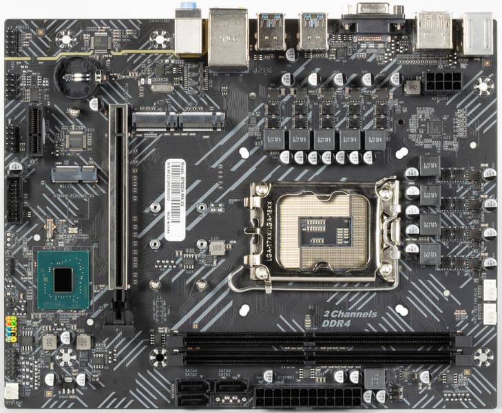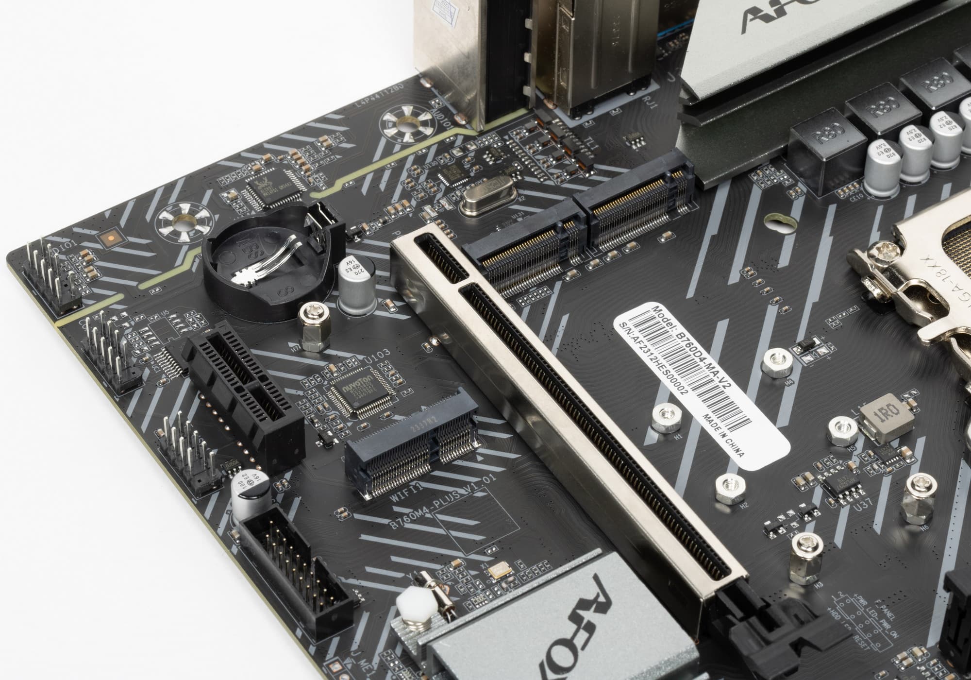 У платы 15 USB-портов, включая 6 портов USB 3.2 Gen1, один «длинный» слот PCIe х16, получающий от процессора 16 линий PCIe, но версии 4.0, и один PCIe x1. Также здесь 2 слота M.2: один из них подключен напрямую к процессору линиями PCIe 4.0, другой подключен к чипсету B760 линиями PCIe 4.0. Еще у этой модели 3 порта SATA и 3 разъема для вентиляторов. Сетевые возможности скромный: только проводной контроллер 1 Гбит/с, плюс слот для беспроводного адаптера. Плата лишена возможности для подключения дополнительных ARGB/RGB-устройств подсветки.