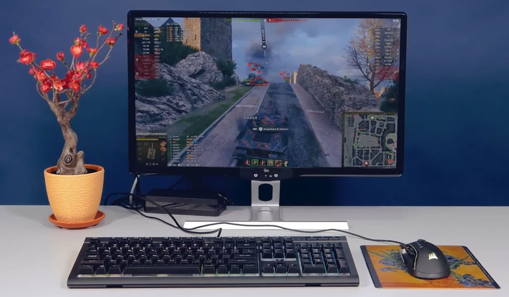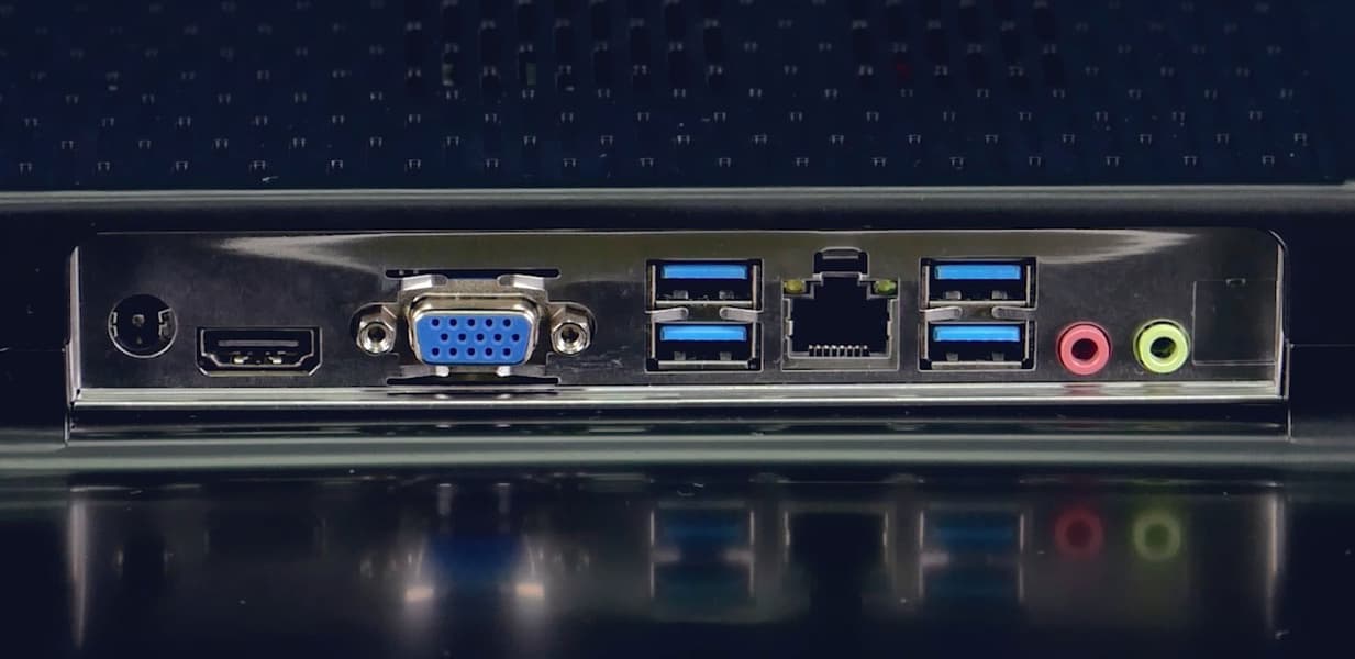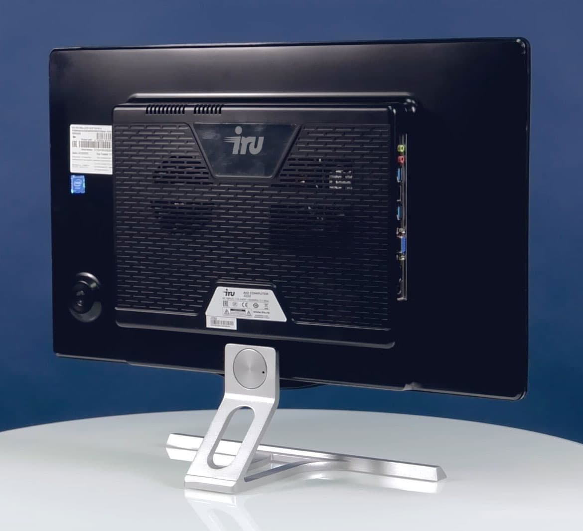В выступающей части корпуса на задней панели скрывается полноценный миниатюрный компьютер на базе кастомной материнской платы iRU на чипсете Intel H110. В данной модели установлен двухъядерный процессор Intel Core i3-6100 с поддержкой технологии Hyper-Threading (4 логических ядра), работающий на частоте 3,7 ГГц, с графическим ядром HD Graphics 530, которое и используется для вывода картинки на экран моноблока и, опционально, на дополнительный монитор. Core i3-6100 — процессор скорее начального уровня, но все же не совсем бюджетный. Он без проблем справляется с типичными офисными задачами, обеспечивает просмотр 4K-видео с аппаратным декодированием, позволяет чуть-чуть поиграть. Так, популярные «танки» на минимальном качестве графики без проблем идут в Full HD (в среднем около 80 fps, без просадок ниже 60 fps), а вот при среднем качестве графики в Full HD уже выдают лишь около 20 fps. Дополняется аппаратная конфигурация моноблока одним модулем памяти на 8 ГБ и SSD-накопителем Crucial BX500 емкостью 240 ГБ. Для беспроводной связи компьютер имеет адаптеры Wi-Fi (802.11ac) и Bluetooth.