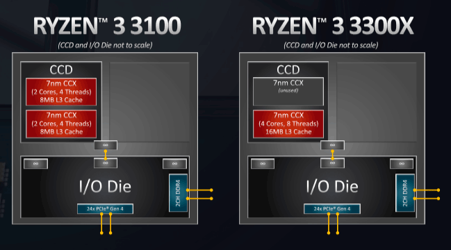 Неудивительно, что AMD фактически представила не одну линейку, а две (пусть и по одной модели в каждой). Ryzen 3 3100 стал «духовным наследником» Ryzen 5 1400: работают оба CCX, но лишь на половину своих возможностей, то есть два ядра из четырех и половинки L3. Это не лучшая конфигурация с точки зрения производительности, зато идеальная для утилизации брака. Такие процессоры могут обходиться компании очень дешево, поэтому их рекомендованная цена соответствует старым младшим Ryzen 3... или Athlon II X4 600. В общем, возвращение народных четырехъядерников, но совсем на другом уровне технологии: включая поддержку PCIe 4.0 и т. п. Естественно, для этого нужны соответствующие системные платы, так что чипсет В550 (о котором мы недавно подробно рассказывали) анонсирован вместе с новыми Ryzen 3.