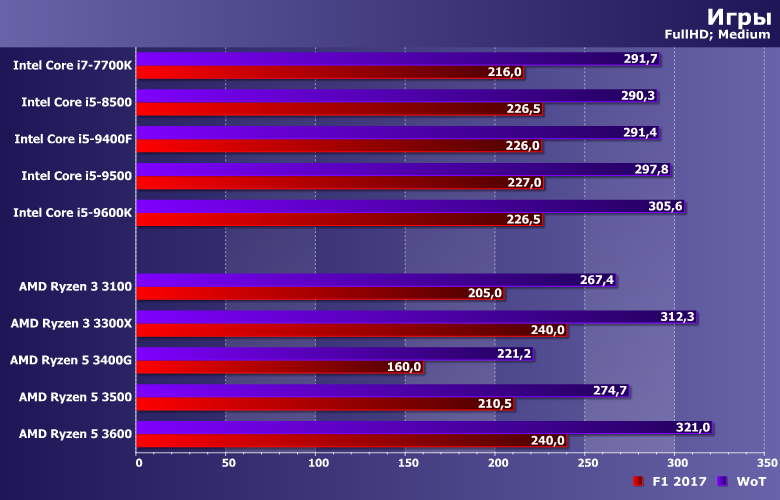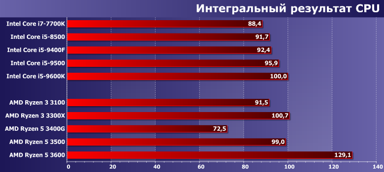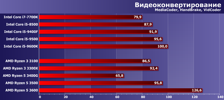 В очередной раз не удивляемся результатам Ryzen 5 3600 — это процессор более высокого класса, нежели прочие испытуемые. Подобные модели совсем недавно Intel продавала под маркой Core i7 и такими будут новые Core i5 — но текущим i5, равно как и «очень старым» i7 от этого не легче. Также без комментариев оставляем результаты Ryzen 5 3400G — вот так, к сожалению, оно все и работало с год назад всего. Зато безусловно на своем месте новые Ryzen 3 — которые сумели обогнать даже Ryzen 5 3500. Не в первый раз уже — почему мы выше и сказали, что эта пара моделей компании нужна была фактически лишь как временное решение. Впрочем, себестоимость его сопоставима с 3100 скорее всего, да и может быть более низкой, чем у 3300X — так что вероятность «глобальной легализации» 3500/3500X существует. Но если этого не произойдет — расстраиваться смысла нет. Да и гоняться за такими моделями, в общем-то, обычно уже тоже.