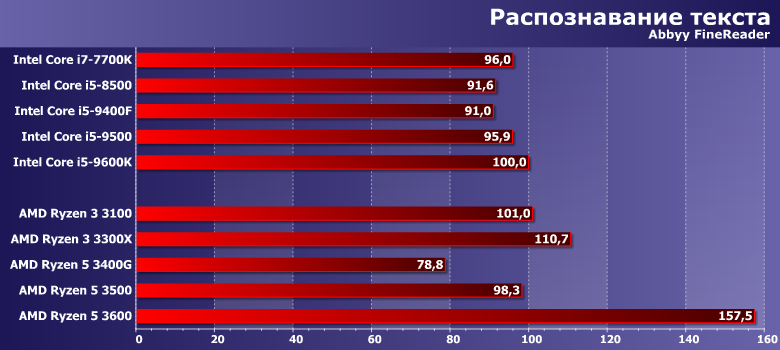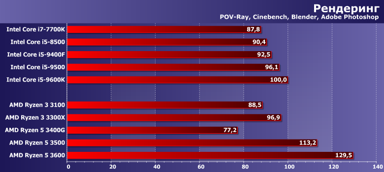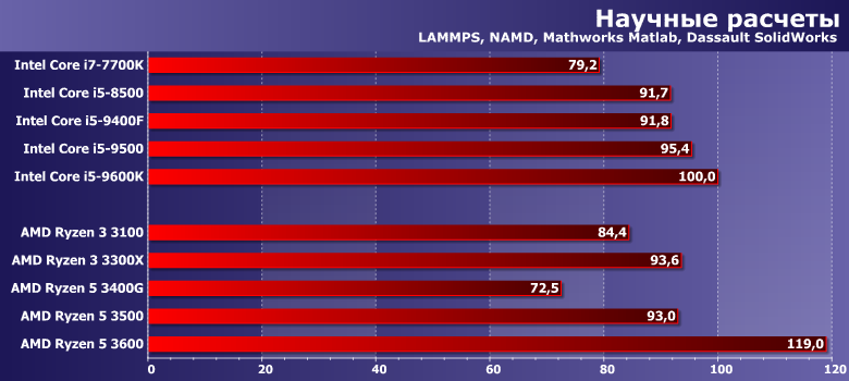 На этом уровне качественные характеристики превалируют над количественными. Оптимизация под Core здесь лучше — во многом потому, что сама архитектура у Intel пока еще старше, а вот все потенциальные возможности Ryzen (особенно последних серий) программистам нужно еще грамотно реализовать. Но в целом самые интересные результаты демонстрируют Ryzen 3 3300X (практически «монолитный» четырехъядерный дизайн и высокие частоты) и ставшие в последнее время хитом Ryzen 5 3600 (заметно превосходящий основную массу конкурсантов).