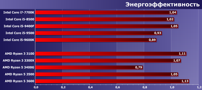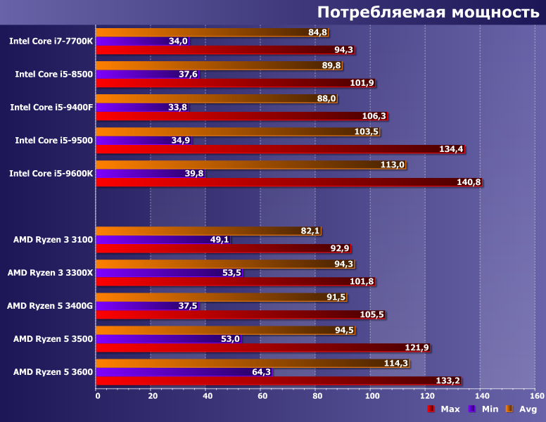 Вот почему выше мы однозначно отнесли тестируемый экземпляр Core i5-9500 к семейству Coffee Lake Refresh, несмотря на официальные данные — энергопотребление «восьмого» поколения похоже на «седьмое», а вот «настоящее девятое» куда более прожорливо. Впрочем, новым Ryzen 3 на этом фоне краснеть не приходится — они-то как раз соответствуют старым моделям Intel, которые в этом плане были лучше более новых. Энергопотребление «старших» конфигураций повыше — хотя и тоже соответствует примерно последним Core i5 для LGA1151.