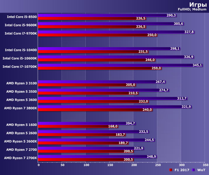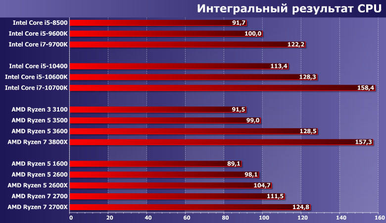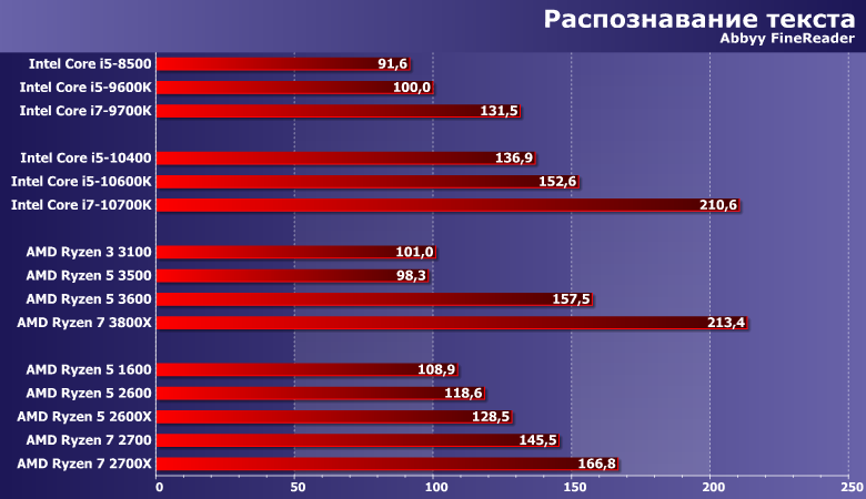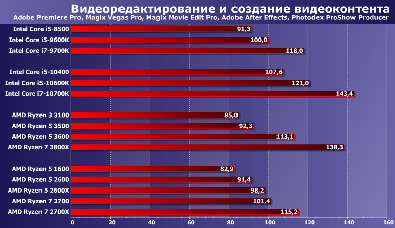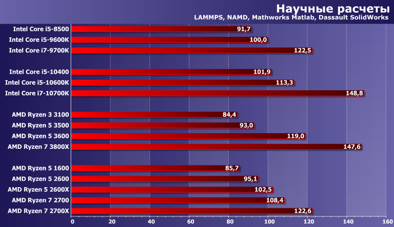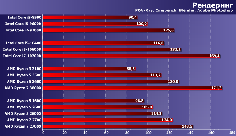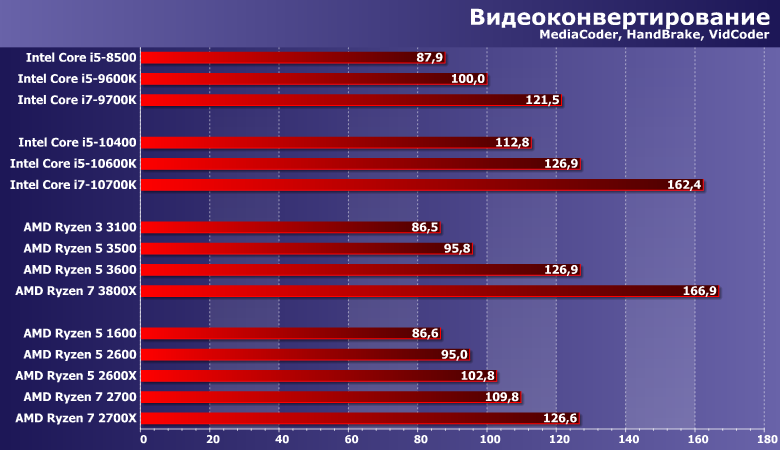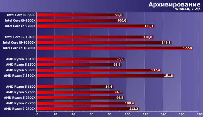 Группа приложений с хорошей утилизацией многопоточности — но, тем не менее, Ryzen 5 1600 (6C/12T) оказался практически равен не только Core i5-8500 (6C/6T), но и Ryzen 3 3100 (4C/8T), а 2600 немного отстал от 3500! То, что не раз было сказано — в общем итоге играет не только количество, но и качество ядер. В случае Ryzen именно последний параметр в первую очередь отличает семейство 3000 от предыдущих. В свою очередь «предыдущие» практически не отличаются — в пределах количественных различий. Ну а дальше — все просто: некогда топовый Ryzen 7 2700X по производительности соответствует лишь Ryzen 5 3600 — или Core i5-10600K. Конкуренция с Intel, впрочем, нормальная — все-таки тут AMD всегда играла на опережение, так что тот же 1600 первое время «бодался» с Core i5 для «первой версии» LGA1151 — всего лишь четырехъядерными без Hyper-Threading. Сейчас все вроде бы хуже — так старые процессоры и подешевели изрядно, а новые решения Intel продаются пока по завышенным (даже сравнительно с рекомендованными) ценам. А вот прогресс в «собственном» семействе показателен — для конкуренции с «новыми» процессорами «старым» нужна лишняя пара ядер. Иначе ничего не получится. Понятно, что это не повод менять Ryzen 7 старых серий на новый Ryzen 5 — но если жмет, то можно уже прицениться к новым Ryzen 7. А то и Ryzen 9 без замены системной платы.