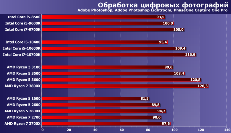 Случай, когда вообще «рулит» однопоточная производительность. И хорошо виден тот переворот, который случился год назад — первые Ryzen всегда выступали в роли мальчиков для битья для Core (даже имея фору в количестве ядер/потоков вычисления), а семейство 3000 вышло в лидеры. Роли радикально поменялись. Причем, что тоже важно, для работы с фото не нужен слишком дорогой процессор. Но Ryzen первых двух линеек не нужны практически вне зависимости от цены.