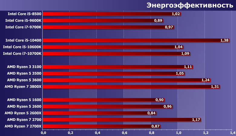 Но если процесс идет «как надо», то производительность увеличивается быстрее — поэтому растет и энергоэффективность. На текущем этапе у AMD успехи в этом плане более впечатляющие... Хотя, честно говоря, Core i5-10400 нас немного поразил. Учитывая, что это фактически еще чистый Coffee Lake образца 2017 года, возникает вопрос — а сразу вот так нельзя было что ли? :)