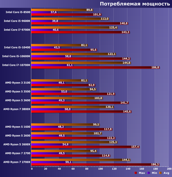 Мы не раз видели выше, как 2700X далеко отрывался от своего собрата «без суффикса» — а теперь становится понятно: почему. Действительно — топовому процессору в линейке AMD настолько пыталась добавить прыти, что пришлось даже немного TDP повысить с 95 до 105 Вт. В итоге из участников тестирования он соответствует только Core i7-10700K — куда более быстрому. А Ryzen 7 3700X/3800X/3800XT и быстрее, и экономичнее — новый техпроцесс позволяет компании добиваться этого одновременно. Intel же стоит перед выбором — быстрый процессор сделать можно, экономичный — тоже (что прекрасно показывает i5-10400), но приходится выбирать. В целом же хорошо заметно, что энергопотребление процессоров обеих компаний с каждым витком конкуренции увеличивается. Но это не новость — и ранее в истории всегда так было: как только начинается борьба, так сразу растут производительность — и энергопотребление тоже.