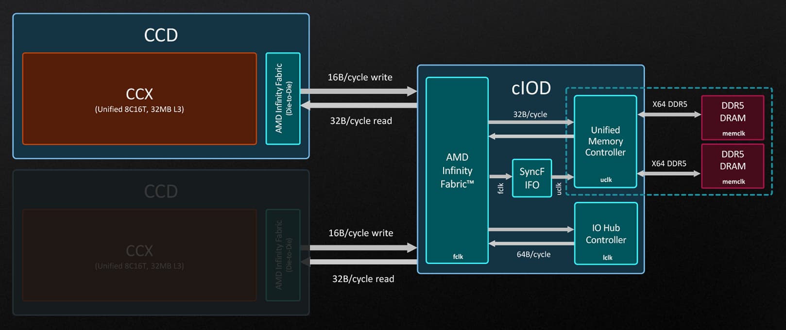 Если процессоры Ryzen 3000 и 5000 использовали кристаллы IOD, произведенные при помощи 12-нанометрового техпроцесса Global Foundries, то перевод на 6-нанометровый процесс TSMC дал приличное улучшение характеристик этих кристаллов. Во многом это касается внедрения в IOD графического ядра архитектуры RDNA2 — в дополнение к логике интерфейсов DDR5 и PCIe 5.0, также более сложных, чем ранее. Новый кристалл IOD содержит двухканальный контроллер памяти DDR5 (четыре 40-битных канала, включая ECC и поддержку аппаратного шифрования — внедрение зависит от производителей системных плат) с официальной поддержкой DDR5-5200, комплекс из 28 каналов PCI-Express 5.0, USB 3.2 контроллер с поддержкой портов 2x2 20 Гбит/с, а также USB-C и DisplayPort для встроенного видеоядра.