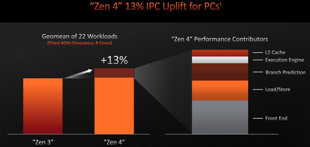 Блок загрузки/сохранения — часть ядра, взаимодействующая с подсистемой памяти, и в Zen 4 на 22% увеличили очередь загрузки, одновременно улучшив разрешение конфликтов портов данных. Объем выделенной кэш-памяти второго уровня в каждом ядре был увеличен вдвое — до 1 МБ, а восемь ядер в CCD совместно используют единую кэш-память третьего уровня объемом 32 МБ. Все вместе улучшения Zen 4 привели к росту производительности на такт (AMD называет это IPC, но это не совсем корректно, так как именно темп исполнения инструкций в синтетических нагрузках увеличился далеко не во всех случаях) на 13% по сравнению с Zen 3. Почти две трети этого прироста приходится на улучшения внешнего интерфейса и этапов загрузки/хранения, улучшения при предсказании ветвлений составляют 20% роста, а L2-кэш — лишь 10%.