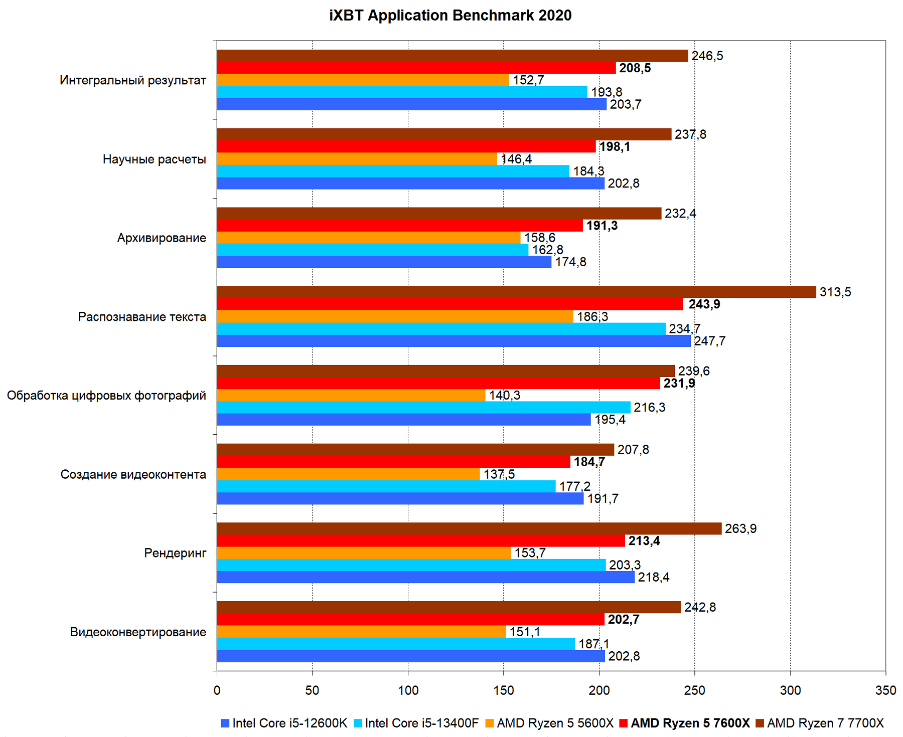 В таких приложениях куда интереснее многопоточный режим, но и в нем преимущество осталось за процессорами AMD, в том числе шестиядерником Ryzen 5 7600X. Он проиграл старшей модели 7700X, конечно же, но для многопотока это нормально. А вот процессоры Intel хоть и имеют большее количество вычислительных ядер, но отстали от сегодняшнего героя и в многопотоке, хотя процессор модели Core i5-12600K и оказался достаточно близок к нему.