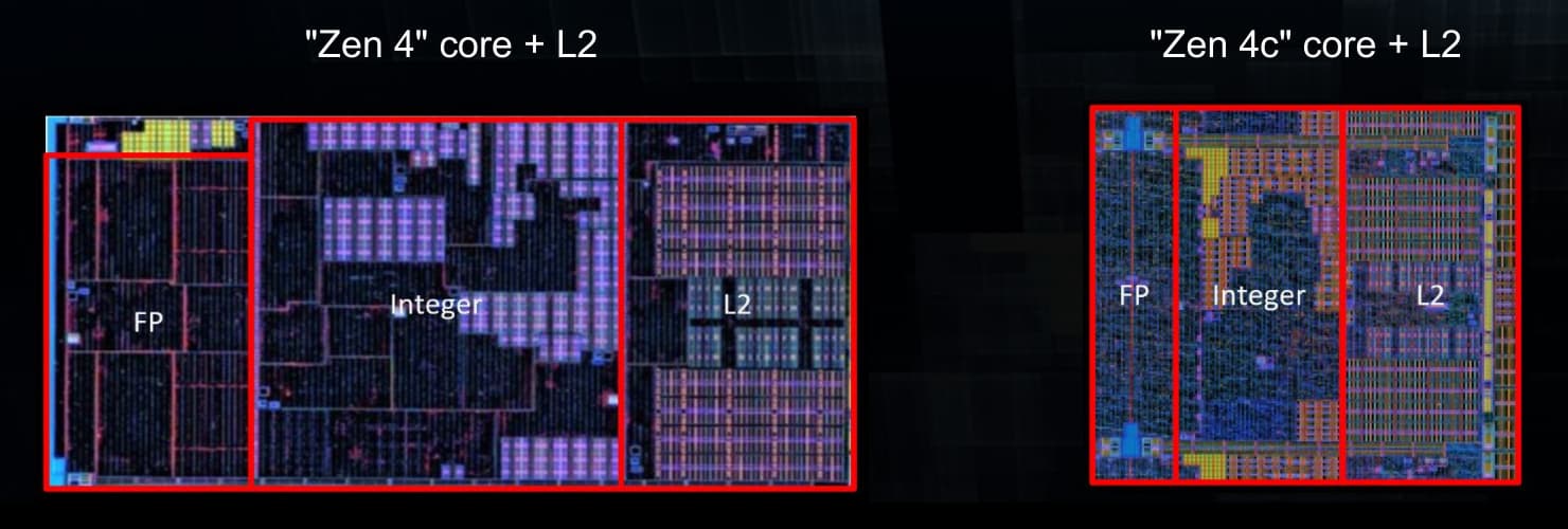 Неоднородные ядра у AMD совсем не похожи на то, что делает Intel с E-ядрами. Производительные ядра Zen 4 и эффективные Zen 4c имеют полностью идентичную производительность на такт, поддерживают одинаковые наборы инструкций и одновременную многопоточность. Эффективные ядра Zen 4c имеют идентичный размер кэшей первого и второго уровней по сравнению с производительными ядрами Zen 4. Все ядра Zen 4 и Zen 4c в едином кристалле Phoenix 2 имеют общий комплекс ядер CCX и L3-кэш объемом в 16 МБ, так что потоки легко могут мигрировать между ядрами двух типов без каких-либо проблем с задержками. Единственная разница заключается в том, что мигрирующие с ядра Zen 4 на ядро Zen 4c потоки получат чуть более низкую производительность. Этот подход существенно отличается от подхода Intel к гетерогенным P- и E-ядрам, которые значительно отличаются друг от друга по возможностям. Кроме этого, Intel полагается на аппаратный планировщик Thread Director, гарантирующий выделение нагрузок разным типам ядер, а AMD использует более простой механизм предпочтительных ядер, когда бо́льшая часть рабочей нагрузки отправляется на более скоростные ядра Zen 4.