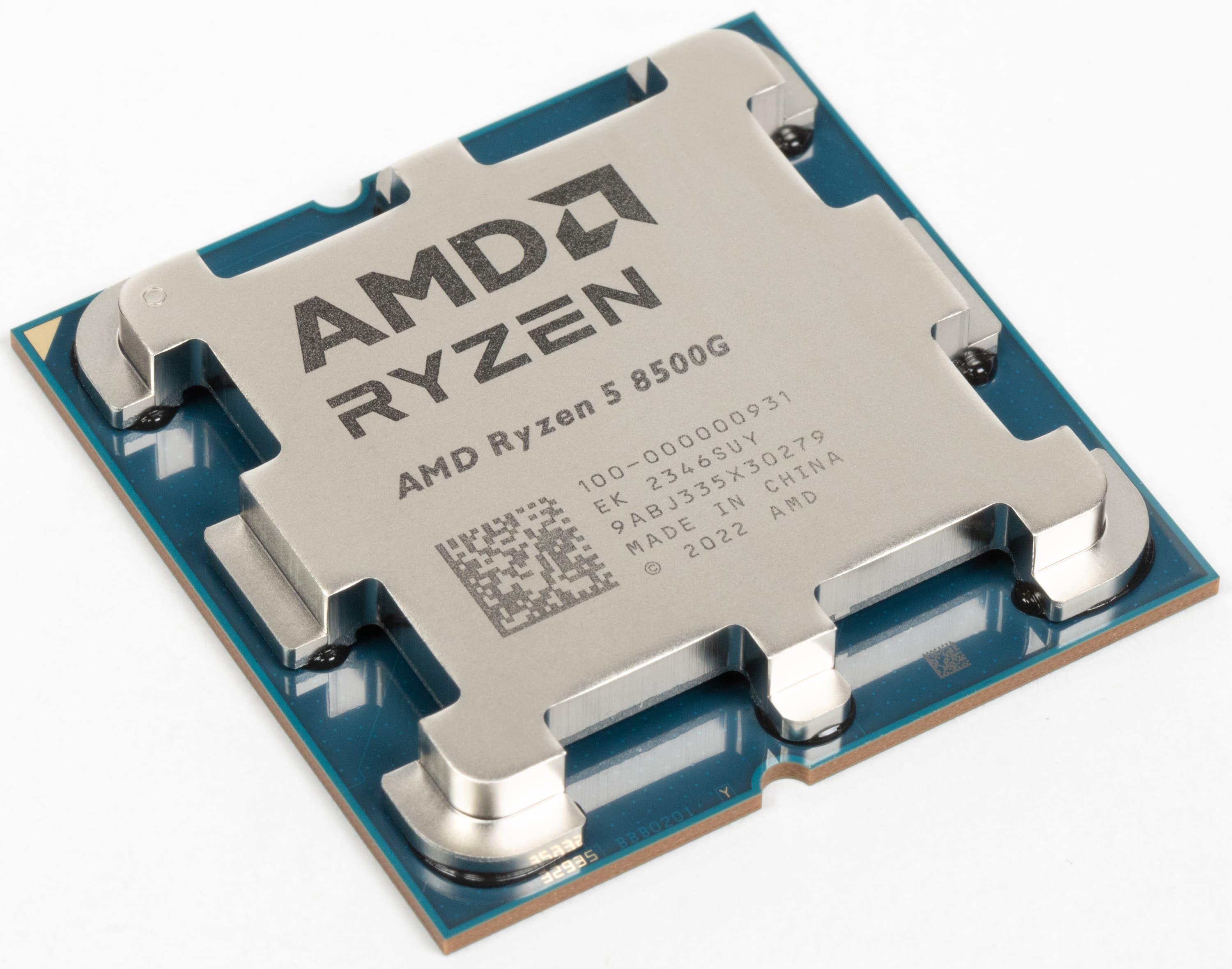 Ryzen 5 8500G поставляется в коробке, аналогичной упаковке процессоров Ryzen 5 7000, и отличие от коробки Ryzen 7 8700G только в том, что на ней не кричат про Ryzen AI, так как этот APU не содержит блока NPU. Коробочная версия включает воздушный кулер Wraith Stealth, который разработан для процессоров с показателем TDP в 65 Вт и отлично подходит для Ryzen 5 8500G. К сожалению, нам достался процессор в OEM-варианте, поэтому коробка на фото — от старшей модели APU. Сам же процессор выглядит аналогично остальным процессорам на Socket AM5, есть лишь мизерные отличия по некоторым компонентам.