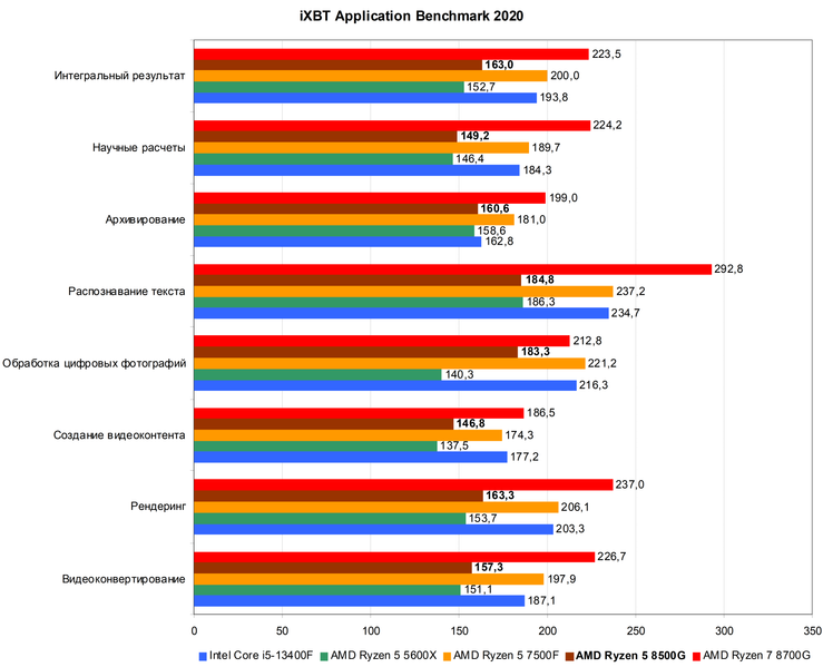 В среднем по всем тестам в требовательных приложениях Ryzen 5 8500G близок к 13400F, хотя обычно немного отстает от этого CPU. Но и это очень хорошо, так как он имеет несколько меньшую цену. Процессор Ryzen 5 7500F намного производительнее в приложениях, а по сравнению с процессорами для Socket AM4 гибридный Ryzen 5 8500G находится где-то между Ryzen 5 5600X и Ryzen 7 5700X, и это очень неплохая производительность для такого бюджетного процессора, предназначенного для сравнительно легких офисных задач.