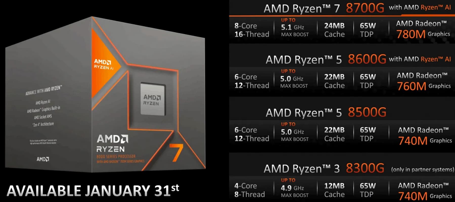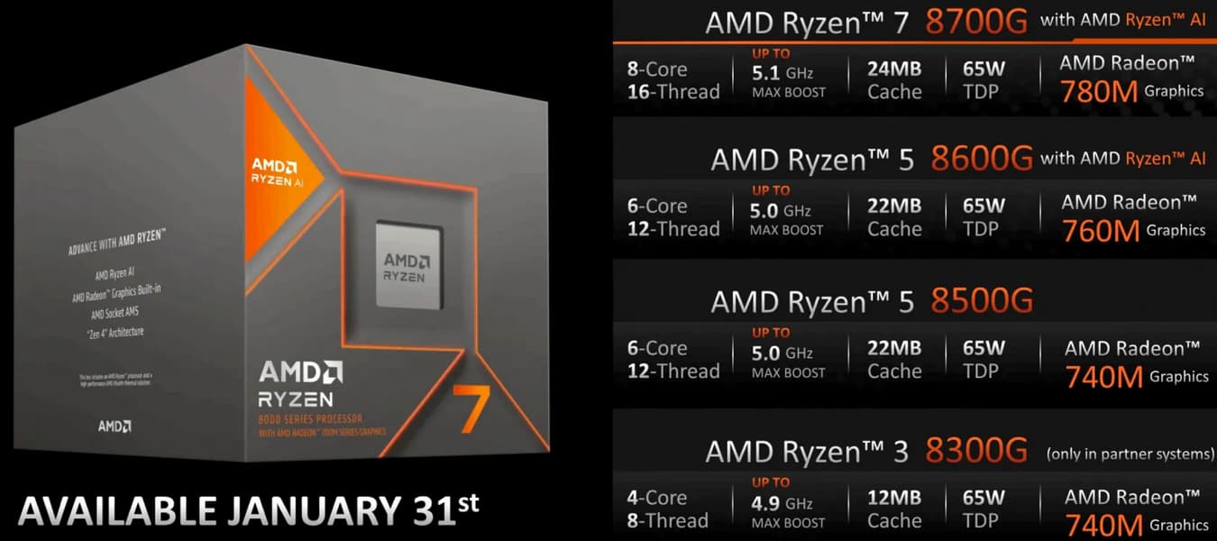 Новая серия APU объединяет основные функции серии Ryzen 7000 для настольных ПК с отличительными особенностями мобильных решений серии Ryzen 8000. Все модели серии Ryzen 8000G имеют типичный уровень энергопотребления в 65 Вт, что выше, чем у мобильных аналогов, и обеспечивает для них некоторый запас мощности, полезный для настольных ПК, так как позволяет поддерживать более высокие тактовые частоты, и особенно это касается графического ядра. Как и их предшественники из серии Ryzen 5000G, новые APU предоставляют некоторые преимущества как мобильных устройств, так и процессорной архитектуры, предназначенной для мощных настольных ПК.