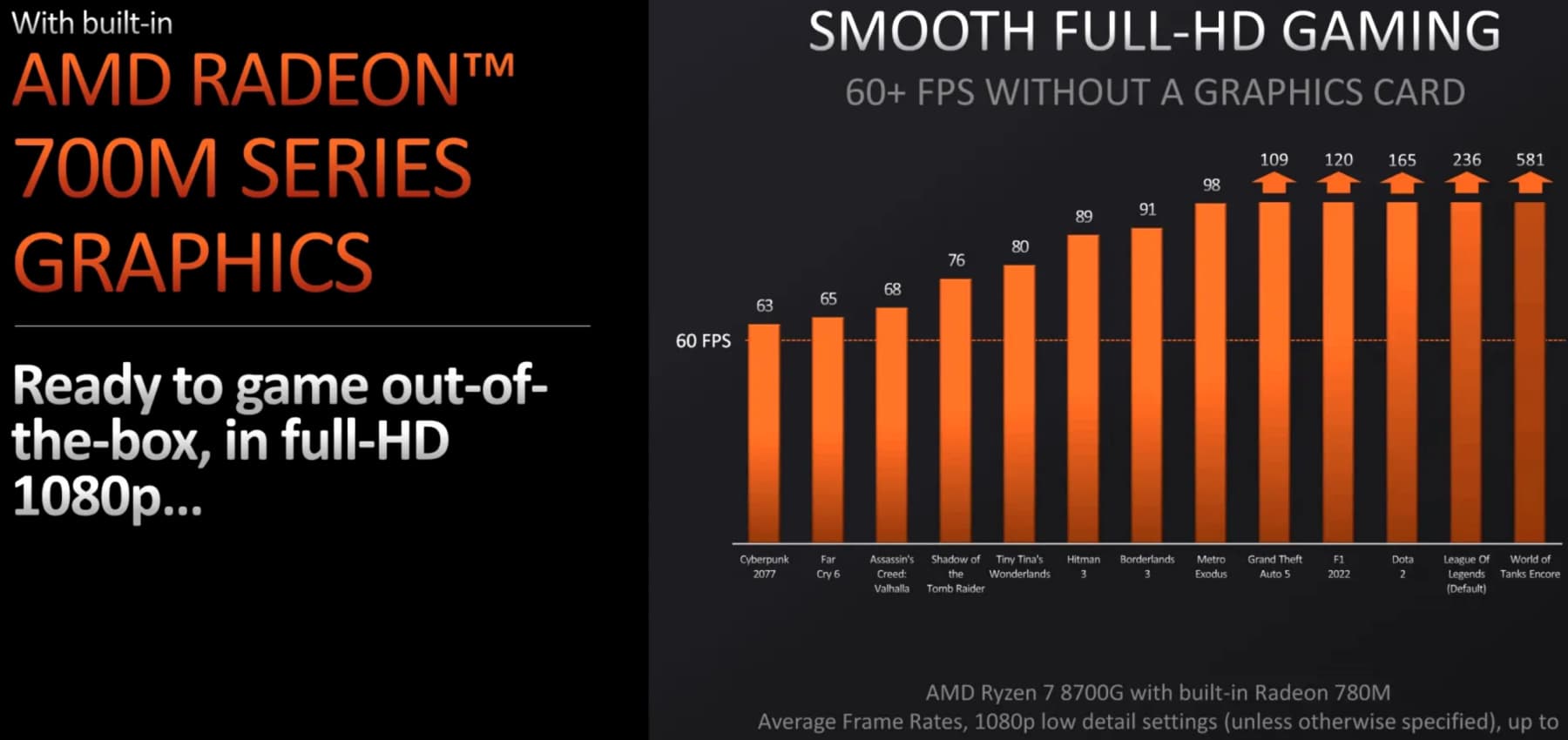 В любом случае, рассматриваемый нами гибридный процессор Ryzen 7 8700G дает хотя бы начальную возможность игры в Full HD при 60 FPS и более, хотя и при условии низких графических настроек — AMD приводит такую диаграмму, где даже в Cyberpunk 2077 показано 63 FPS. На наш взгляд, можно даже повысить настройки многих игр хотя бы до средних, чтобы получить пусть не стабильные 60 FPS всегда, но зато насладиться тем, для чего обычно покупаются дискретные видеокарты — качественной графикой в современных играх.