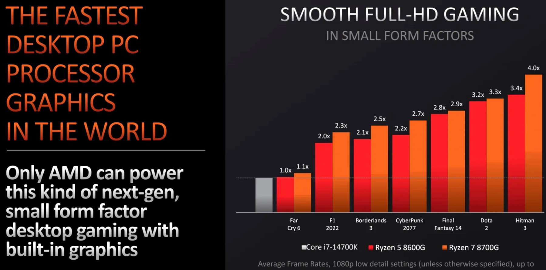 Далее специалисты компании сравнили старшие модели Ryzen 7 8700G и Ryzen 5 8600G с процессором Intel Core i7-14700K, имеющим встроенное графическое ядро UHD Graphics 770, основанное на устаревшей архитектуре Xe-LP, а не более новой Alchemist, на базе которой интегрированного GPU они пока что не предлагают. По оценкам самой AMD, даже их Ryzen 5 8600G превосходит Core i7-14700K до трех раз и более — в играх с низкими настройками графики и Full HD разрешением, а флагманский 8700G опережает соперника и вовсе до четырех раз. Это неплохая заявка на победу и как раз настало время проверить, чем же хорош рассматриваемый гибридный процессор и сможет ли он заменить не только CPU, но и дискретный GPU.