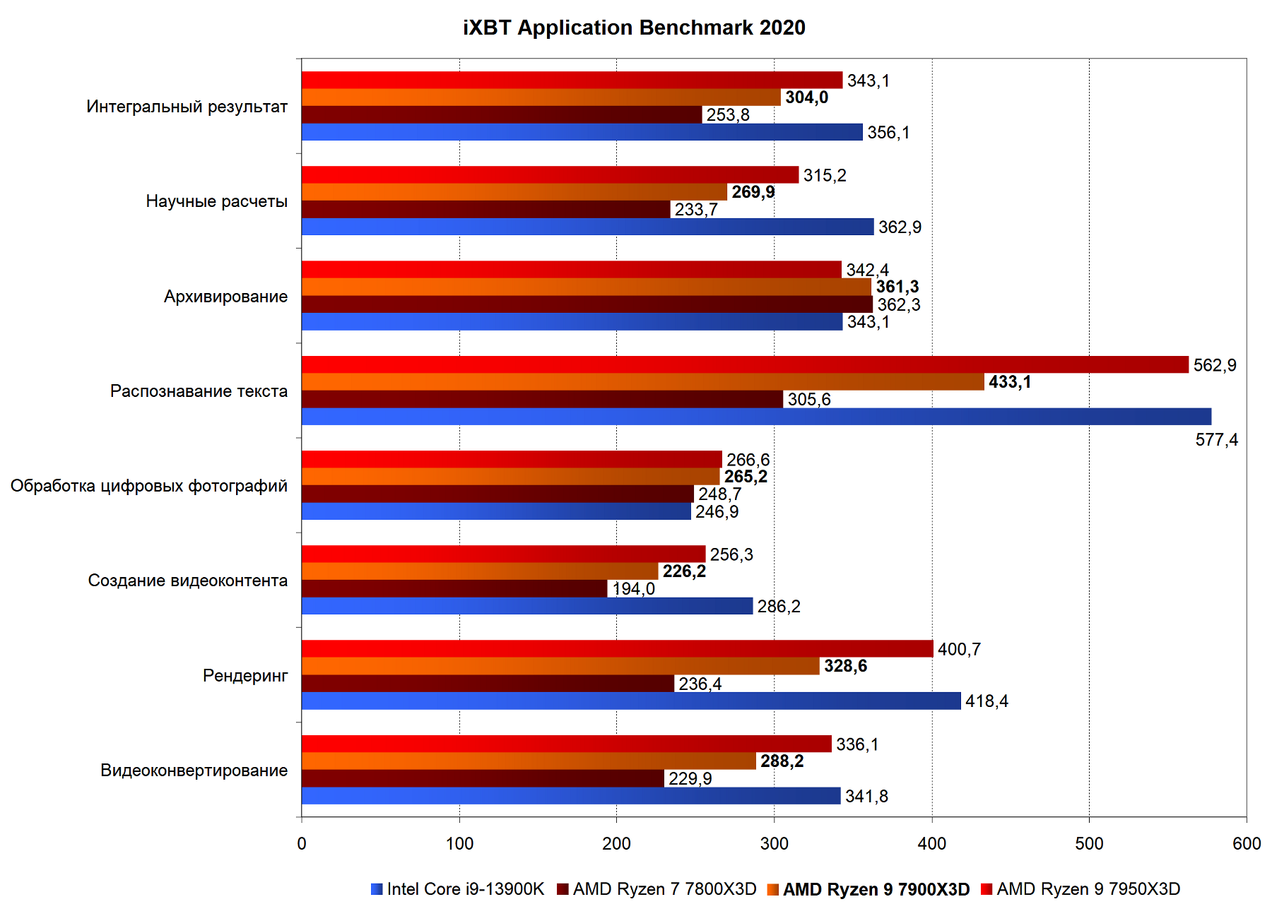 По интегральному результату видно, что Ryzen 9 7900X3D показывает производительность почти четко между 7800X3D и 7950X3D — примерно соответственно количеству вычислительных ядер. Но всё же рассматриваемый процессор по скорости чуть ближе к 16-ядернику, чем к варианту с единственным чиплетом на 8 ядер, вообще не имеющим более быстрых ядер без дополнительного кэша. Примерно так и должно получаться, исходя из чисто теоретических показателей, и 7900X3D вполне оправдывает свою цену, несмотря на неоднозначную конфигурацию из 6+6 неоднородных вычислительных ядер — явных проблем ему она не принесла, как минимум пока — без учета игр.