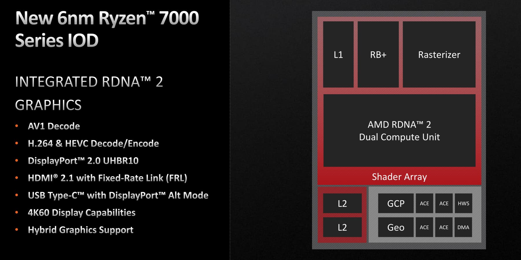 Наибольшую часть кристалла IOD занимает встроенная графика, которая не встречалась ранее в высокопроизводительных настольных процессорах AMD. Теперь же, ядро современной графической архитектуры RDNA 2 с поддержкой трассировки лучей появилось в новых CPU компании. Пусть это ядро и не слишком мощное, оно внедрено для того, чтобы интегрированная графика была во всем наборе процессоров компании. Встроенное видеоядро и не бывает мощным, а с двумя вычислительными блоками CU (один двойной вычислительный блок архитектуры RDNA 2), это в шесть раз меньше, чем у топовых мобильных APU Ryzen или в дискретной видеокарте модели Radeon RX 6400. Такая конфигурация GPU явно не рассчитана на то, чтобы заменять серьезные видеокарты, но при этом она нормально работает в офисных нагрузках и обеспечивает высокую функциональность, пусть и в сочетании с весьма низкой 3D-производительностью.