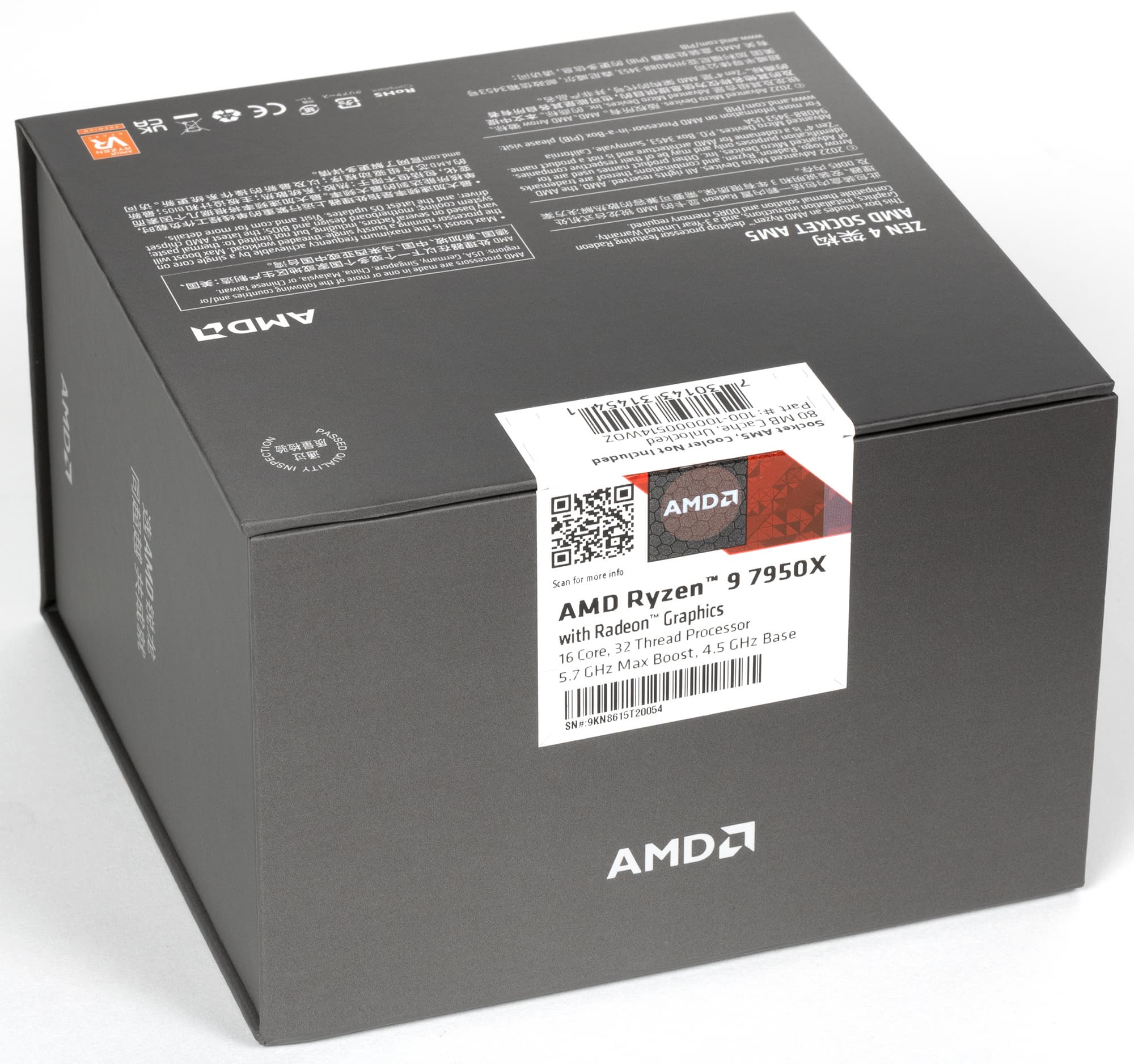 Вкратце рассмотрим выпущенные в первой волне модели процессоров, и начнем с топового Ryzen 9 7950X, который имеет 16 ядер новой микроархитектуры Zen 4, в которой нам было обещано улучшение как однопоточной, так и многопоточной производительности. В достижении первой цели Ryzen 9 7950X поможет высокая тактовая частота — при 4,5 ГГц базовой частоты, максимальная может достигать приличных 5,7 ГГц, что является рекордом на момент анонса этой модели. Но архитектура Zen 4 отличается вовсе не только увеличенной тактовой частотой, в ней есть много нового, в том числе повышенное количество исполняемых инструкций за такт (IPC) в среднем на 13%, появилась поддержка набора инструкций AVX-512, увеличен объем кэш-памяти и т. д. — так что Zen 4 берет далеко не только тактовой частотой.