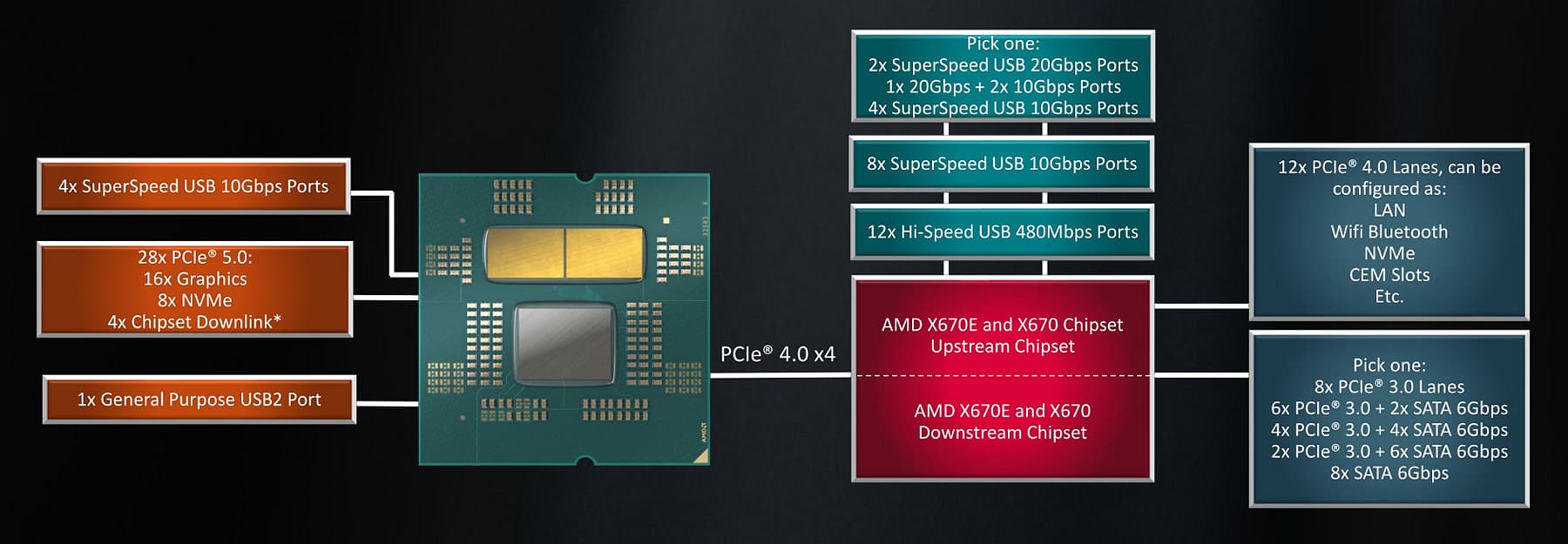 Забавно, что чипсет модели X670 обеспечивает почти ровно вдвое большее количество портов и линий PCIe, по сравнению с B650. Он официально состоит из пары чипов, один из которых подключается к CPU по четырем линиям PCIe 4.0, а второй чип подключается к первому по другому соединению PCIe 4.0 x4. К экстремальной версии X670E предъявляются те же требования к PCIe 5.0, что и у B650E — экстремальные платы предлагают подключение PCIe 5.0 как минимум для одного слота PCIe x16, а платы X670 поставляются с разъемами PCIe 4.0.