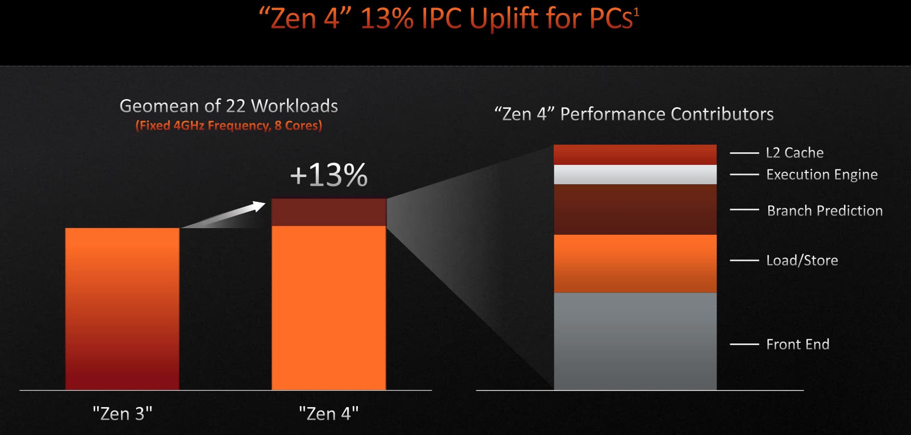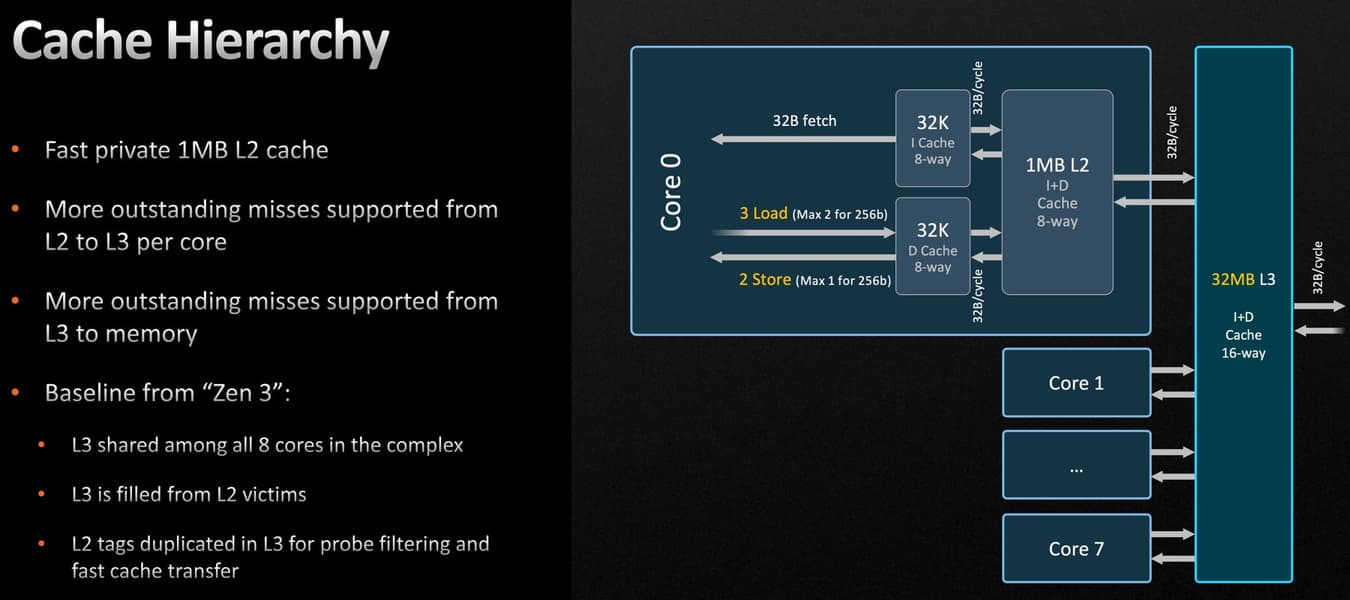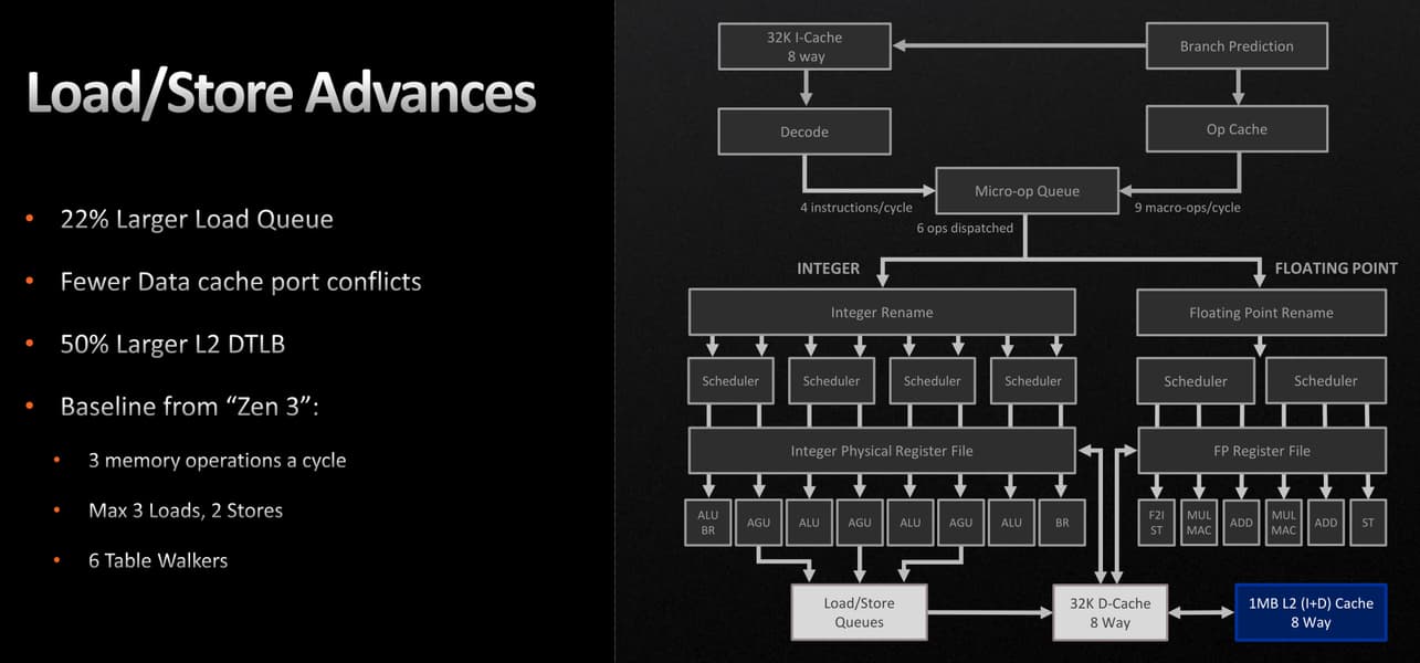 Судя по данным самой компании, полученным на фиксированной частоте в 4 ГГц, новое поколение микроархитектуры получило этот прирост от изменений в конвейере, L2-кэше, блоках предсказания ветвлений и блоках загрузки/сохранения. Но радикальных изменений в Zen 4 нет, особенно в конвейере и его стадиях, а улучшения во многом связаны с увеличением размеров кэшей и буферов — AMD в своих материалах об этом прямо пишет.