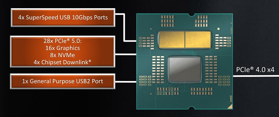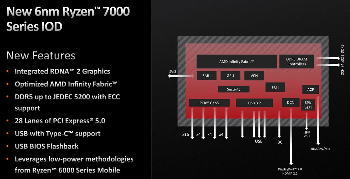 Как и пара предыдущих поколений настольных процессоров Ryzen, новая серия использует чиплетную компоновку — процессоры состоят из нескольких кристаллов, соединенных на одной подложке. Процессоры серии Ryzen 7000 состоят из кристалла ввода-вывода (IOD) и одного-двух кристаллов с вычислительными ядрами (CCD) и связанной с ними кэш-памятью трех уровней, их количество зависит от числа ядер в CPU. По функциональности кристалл IOD отвечает за реализацию новых возможностей платформы AM5, связывая весь чип вместе, объединяя возможности кристаллов с вычислительными ядрами и дополняя их общими блоками. IOD содержит логику, связанную с обеспечением работы линий PCIe 5.0, встроенный контроллер DDR5-памяти и интегрированное графическое ядро на базе графической архитектуры RDNA 2.