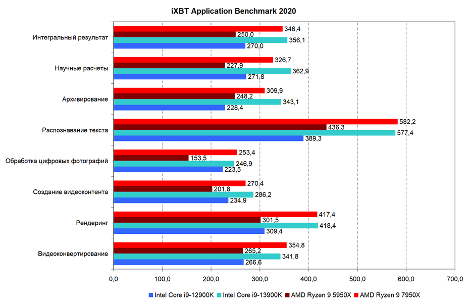 Но есть и разница. К примеру, в научных расчетах чуть лучше выступают процессоры Intel, и сегодняшняя новинка проигрывает Core i9-13900K в этом наборе тестов. То же самое касается задач архивирования данных — несмотря на то, что в предыдущих тестах Ryzen 9 7950X и Core i9-13900K были близки, в тестовом наборе iXBT 2020 лучшим оказался процессор Intel. В среднем же топовые процессоры AMD и Intel весьма близки, что и подводит к главному выводу — нужно смотреть на конкретные задачи, а не на усредненные значения по набору тестов.
