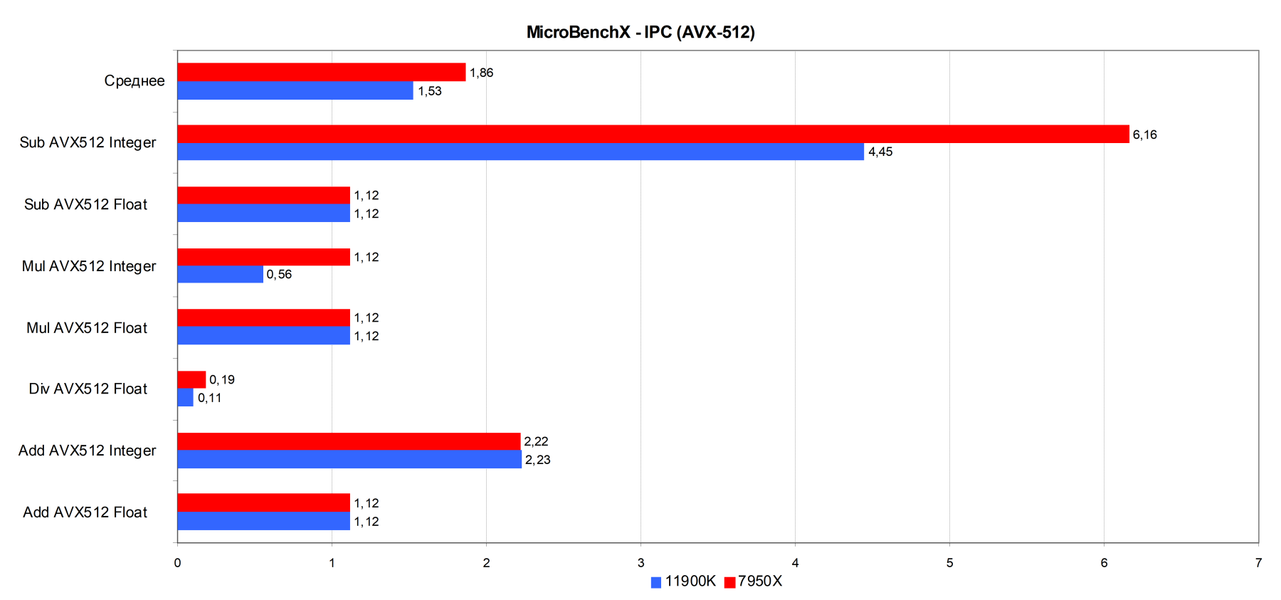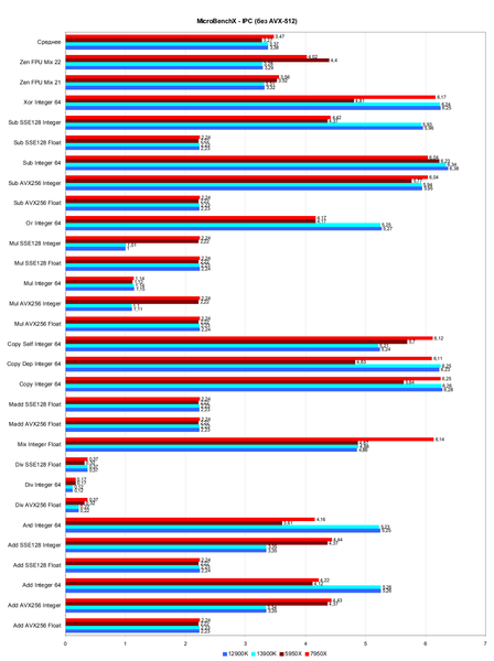 Когда говорят об улучшениях производительности, то чаще всего имеют в виду увеличение IPC, но тактовая частота имеет не меньшее значение — производительность увеличивается с ее увеличением почти линейно, если кэши работают достаточно хорошо, устраняя узкие места доступа к оперативной памяти. И при выборе между увеличением кристалла и ростом тактовой частоты проще получить более высокую общую производительность именно во втором случае. Вероятно, в AMD решили не усложнять такие структуры, как планировщики и очереди хранения именно в пользу повышения частоты ядра, и тактовая частота у Zen 4 получилась заметно выше. Кроме этого, нужно учесть поддержку AVX-512 инструкций. Программное обеспечение, использующее их, сможет выполнять тот же объем работы при помощи меньшего количества инструкций, а это хоть и более низкий IPC, но зато более высокая общая производительность за такт. В реальных рабочих нагрузках, которые используют преимущества AVX-512, Ryzen 9 7950X имеет большое преимущество перед предшественником и главным конкурентом из ассортимента Intel — Core i9-13900K.