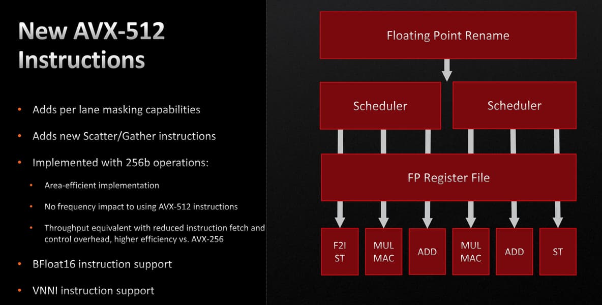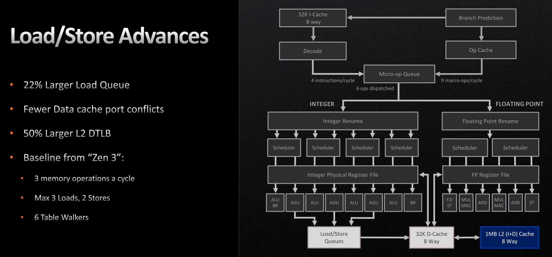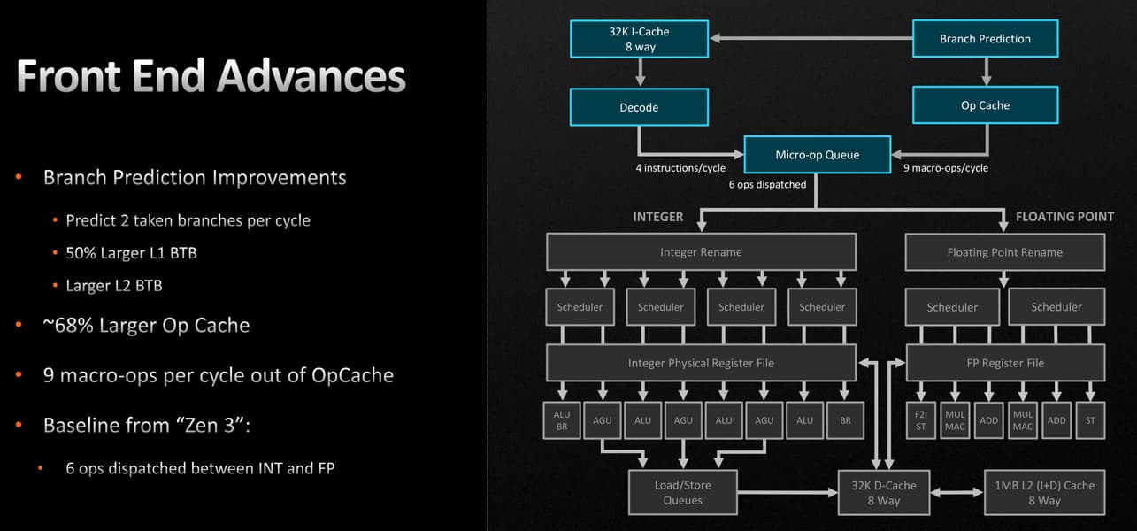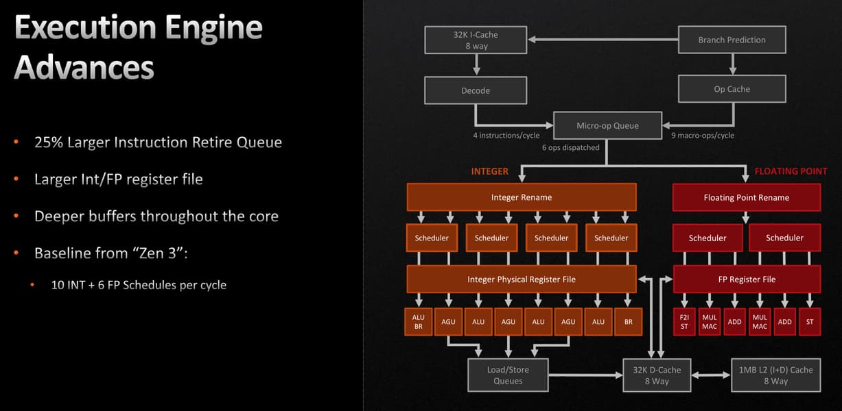 Схема планировщика и конвейера исполнения по сравнению с Zen 3 не изменилась, планировщик в Zen 3 и так был значительно обновлен по сравнению с Zen 2. Скорее всего, AMD решила увеличить тактовую частоту, а не увеличивать производительность планировщика на такт, ведь производительность хорошо масштабируется тактовой частотой. Инженеры компании определили, что могут получить больший общий прирост производительности при более высоких тактовых частотах, по сравнению с увеличением IPC при помощи улучшений планировщика.