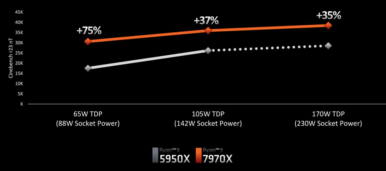 По данным самой AMD, новая модель CPU эффективнее справляется с работой при разных значениях ограничения питания, от 65 Вт до 170 Вт (хотя для Ryzen 9 5950X последнее значение и выходит за рамки номинального потребления, но достичь его можно). Одной из главный целей при создании нового семейства было обеспечение большей мощности в пике для Ryzen 7000, чтобы они могли поддерживать более высокую частоту вычислительных ядер в многопоточных нагрузках, вроде рендеринга, который мы и наблюдаем на слайде компании в виде многопоточного теста Cinebench R23. По этим данным, наблюдается прирост энергоэффективности и при более низких значениях потребления энергии — при максимальном потреблении в 88 Вт (номинальном 65 Вт) новая модель Ryzen 9 7950X обеспечивает прирост производительности сразу на 75% относительно Ryzen 9 5950X.