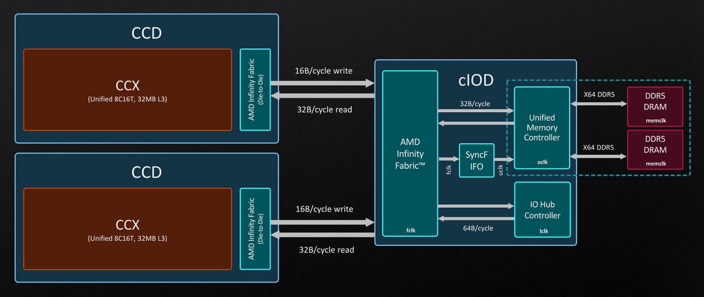 Еще одним важным улучшением, связанным с IOD, является внутренняя шина Infinity Fabric (IF), соединяющая чиплеты: IOD и CCD. При проектировании процессоров серии Ryzen 7000 была проведена дополнительная работа по снижению энергозатрат на передачу данных по IF и повышению общей энергоэффективности. Инженеры AMD решили оставить ту же пропускную способность IF, что и в предыдущем поколении, сузили ширину канала вдвое, но удвоив при этом частоту работы. Казалось бы, что это застой, но инженеры AMD говорят, что пропускная способность, обеспечиваемая каналами IF в Ryzen 7000, вполне достаточна для новых процессоров даже с учетом возросшей при переходе на DDR5 пропускной способности памяти.