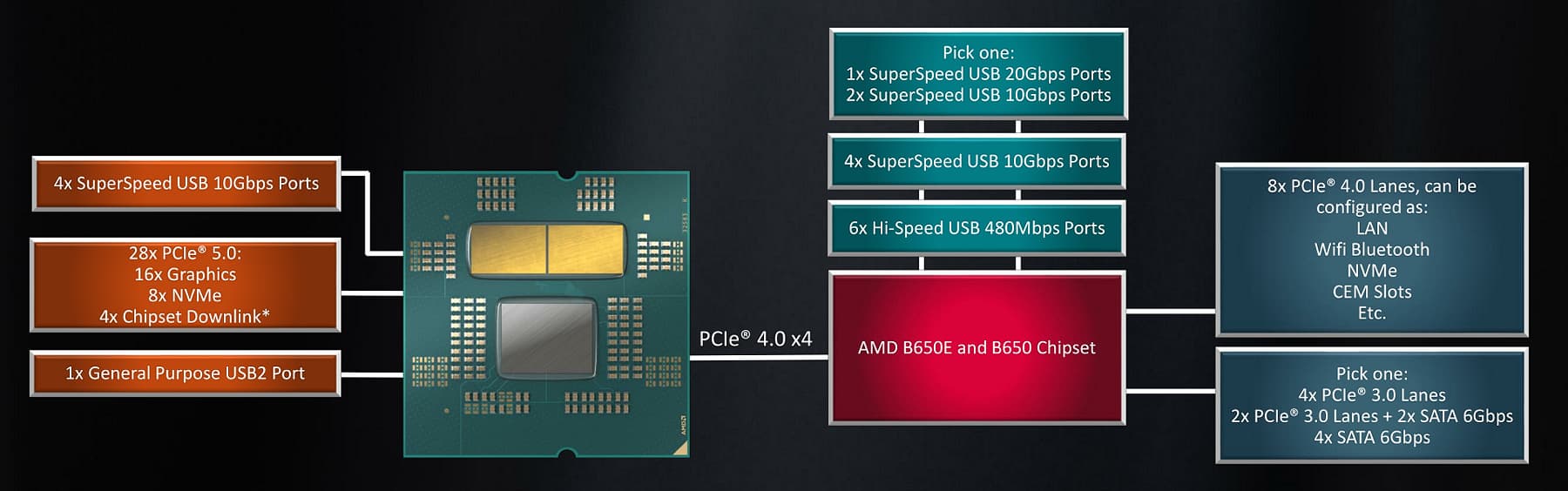 Компания AMD предъявляет некоторые требования к производителям системных плат на базе своей новой платформы — платы на основе B650 и X670 должны поддерживать как минимум одно PCIe 5.0 x4 соединение для накопителя — хотя новые процессоры способны поддерживать и два таких устройства на этой скорости, но производители системных плат решают, нужно ли им это при возросшей сложности маршрутизации PCIe новой версии. Для плат, которые используют экстремальные версии чипсетов, также требуется поддержка PCIe 5.0 хотя бы в одном слоте PCIe — для подключения видеокарт будущего. Обычные версии чипсетов этого не требуют, но производители плат в теории могут сделать поддержку новой версии, не оставляя преимуществ экстремальным версиям. Но это — на усмотрение производителя системной платы, так как чем больше слотов PCIe 5.0 они реализуют, тем выше будет себестоимость.