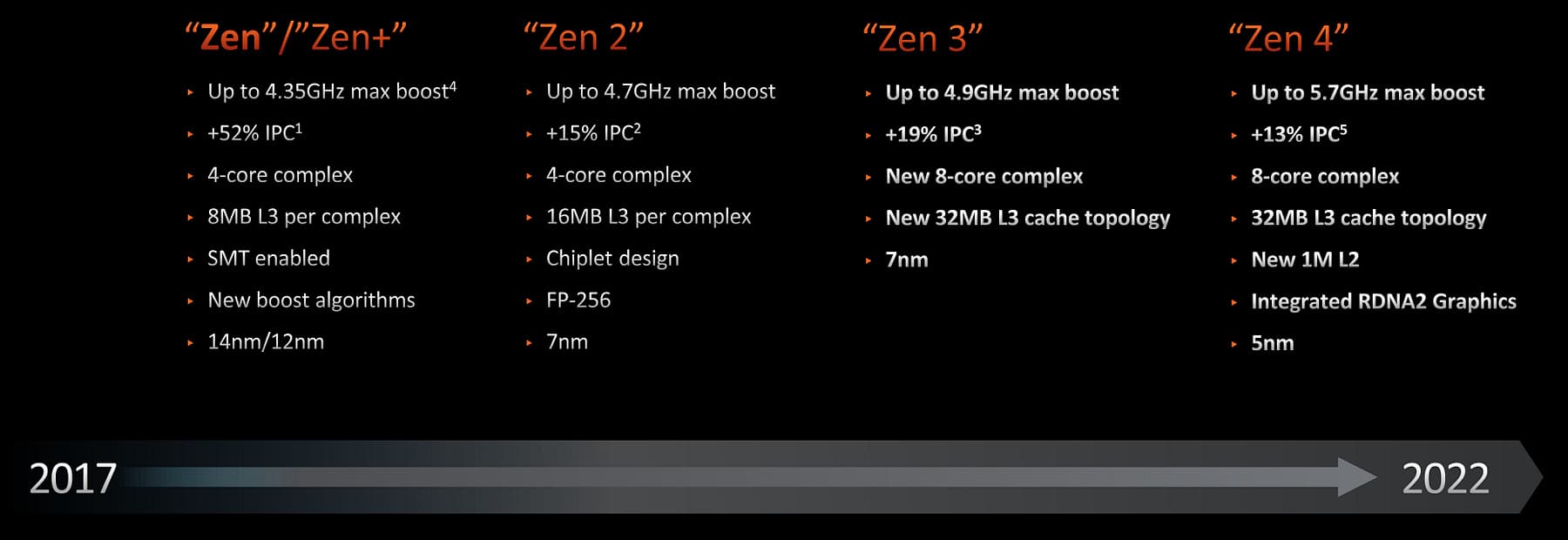 Первые процессоры Ryzen на базе архитектуры Zen компания AMD выпустила еще в 2017 году — именно они позволили им вернуться в борьбу на рынке процессоров, а не оставаться производителем бюджетных и менее производительных вариантов. За пять лет вышло уже несколько поколений Ryzen и все они были достаточно конкурентоспособными и предлагали как рост производительности, так и все большую функциональность — в том числе за счет освоения более продвинутых технологий производства. В целом, переход на новый техпроцесс у AMD занимает примерно два года, но не каждые два: Zen появился в начале 2017, затем Zen 2 вышли в середине 2019 с переходом с 14 нм на 7 нм, далее был Zen 3 в конце 2020, после чего наконец последовал Zen 4 ближе к концу 2022 — переход от 7 нм к 5 нм.
