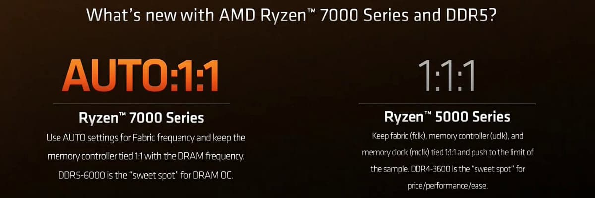Кроме стандартных скоростей JEDEC, процессоры серии Ryzen 7000 поддерживают и разгон памяти, и вот как раз тут произошли некоторые важные изменения. На процессорах семейства Ryzen 5000, идеальный разгон памяти получался при синхронизации тактовой частоты внутренней шины, контроллера памяти и частоты памяти на одинаковой частоте. Так что выбор режима DDR4-3600 оказался золотой серединой для старой платформы, так как при превышении частоты памяти остальные составляющие могли работать уже не синхронно.