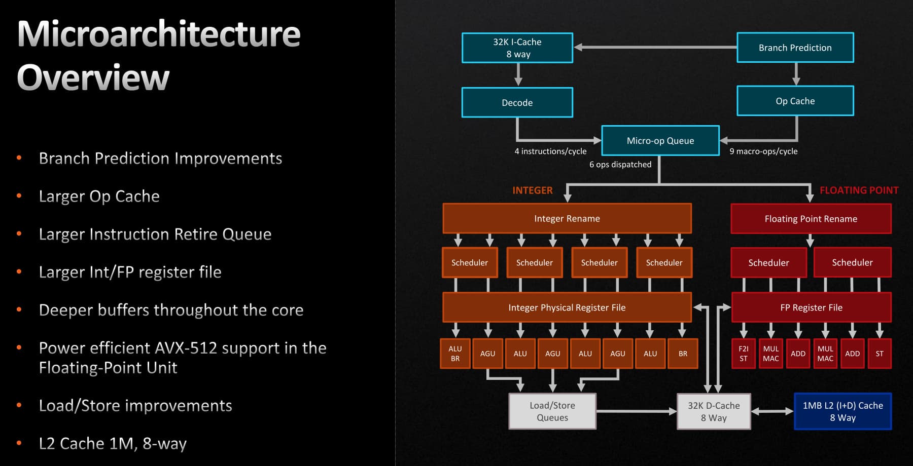 Было улучшено предсказание ветвлений — это часто улучшают в CPU для значительного прироста производительности с учетом выигрыша от правильного прогнозирования. Точное предсказание ветвлений снижает лишнюю работу, улучшая производительность и энергоэффективность. И по мере увеличения возможностей переупорядочивания инструкций в процессорах, точность предсказания ветвлений становится еще более важной, так как работа, стоящая в очереди при неправильно предсказанном ветвлении, просто бесполезна.