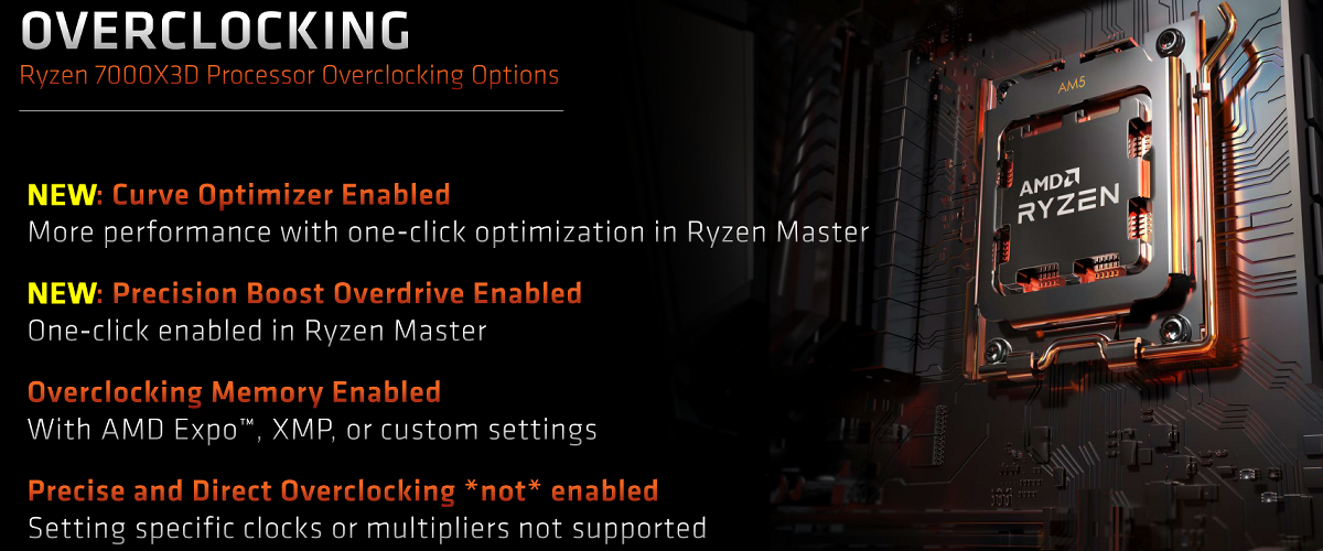 Из других интересных нововведений, связанных с частотой, потреблением и нагревом, отметим то, что в отличие от Ryzen 7 5800X3D с первым поколением 3D-кэша, в новых процессорах есть возможность разгона при помощи технологии Precision Boost Overdrive (PBO) и при помощи изменения кривой частот и напряжения Curve Optimizer, при том, что множитель изменять всё равно не дают. Можно воспользоваться ручным режимом разгона PBO, установить ограничения мощности повыше, а также включить Curve Optimizer на −15...−20 для всех ядер. Температура ядер при этом вырастает и температурный предел в 89 °C будет достигаться быстрее обычного — при толстой крышке процессоров Zen 4 удержать температуру CPU ниже его не получится, даже если радиатор охлаждения будет не слишком горячим. Проблема ведь не в том, что радиатор перегревается, а в том, что эффективно передать тепло от маленьких вычислительных кристаллов через толстую распределительную крышку к нему просто невозможно.