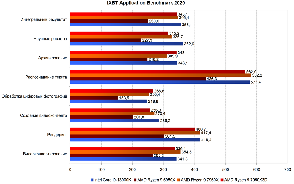 Многопоточный режим в таких приложениях всё равно куда важнее, и в нем преимущества у 7950X перед 7950X3D уже почти нет, что немного удивительно — мы полагали, что бескэшевая модель выиграет привычные несколько процентов. Общее лидерство осталось за процессорами AMD, хотя Core i9-13900K почти не отстал. Что совсем неудивительно потому, что процессоры Intel почти всегда имеют большее количество вычислительных ядер по сравнению с решениями AMD того же ценового сегмента.