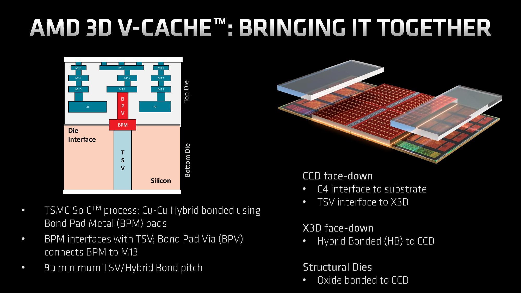 Технология трехмерного стека основана на технологии SoIC компании TSMC. Чиплет с кэшем укладывается в стек (стопку) над вычислительным кристаллом и соединяется с ним двумя типами соединительных линий TSV — для передачи питания и данных. В первом поколении оба типа TSV были расположены в области основного L3-кэша вычислительного чиплета, но на новом кристалле кэш-память занимает меньшую площадь из-за техпроцесса 5 нм, и даже при уменьшенном размере 7-нанометрового чиплета с кэшем, он накрывает не только область с L3, но и L2-кэш на чиплете. Поэтому AMD пришлось изменять соединения TSV и в вычислительном кристалле и в чиплете с кэшем. Пришлось расширять соединения TSV, предназначенные для питания, так как в области L3-кэша на CCD физически не хватило места. Сигнальные же соединения остались внутри площади L3-кэша на вычислительном кристалле, но специалисты компании сократили их площадь вдвое.