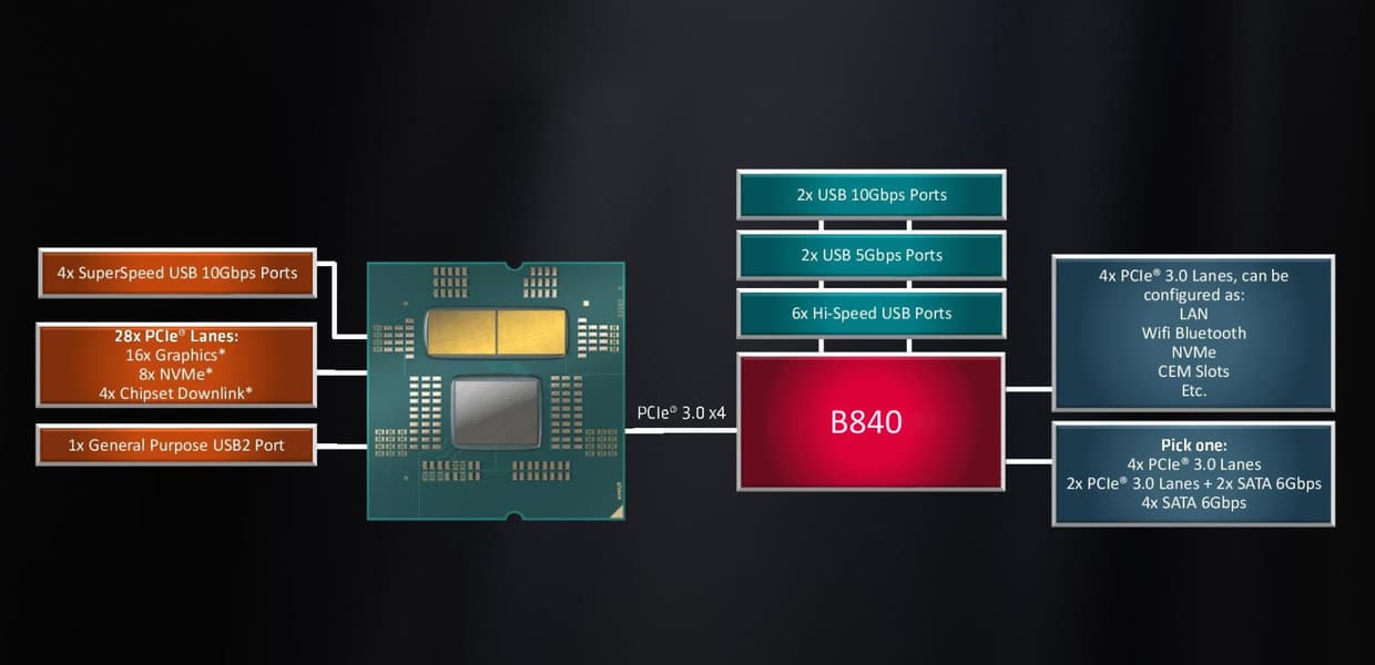Младшая модель чипсета B840 получила индекс B в названии, хотя это последователь бюджетного A620 из прошлой линейки чипсетов, да и характеристики у него такие же. По A620 мы помним, что сначала там использовался тот же чип Promontory 21 в урезанном виде, а позднее выпустили чипсет A620A с теми же характеристиками на упрощенном чипе Promontory 19. На нем же основан и чипсет B840. Разъем видеокарты и NVMe-накопители при подключении к процессору в B840 ограничены шиной PCIe 4.0, быстрых портов USB 4 и USB 3.2 Gen 2x2 тут нет. Также на платах с B840 не разрешен разгон процессора, в отличие от старших чипсетов линейки, хотя память разгонять можно.
