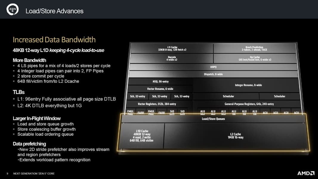 Блок загрузки/сохранения также получил несколько улучшений для удовлетворения растущих требований со стороны блоков исполнения. Кэш данных первого уровня был увеличен до 48 КБ с 12 каналами — по сравнению с 32 КБ и 8 каналами у Zen 4, а также были проведены улучшения в каналах загрузки/сохранения с комбинацией из 4 загрузок и 2 сохранений за цикл. Четыре целочисленных канала загрузки могут объединяться в канал для работы с плавающей запятой.