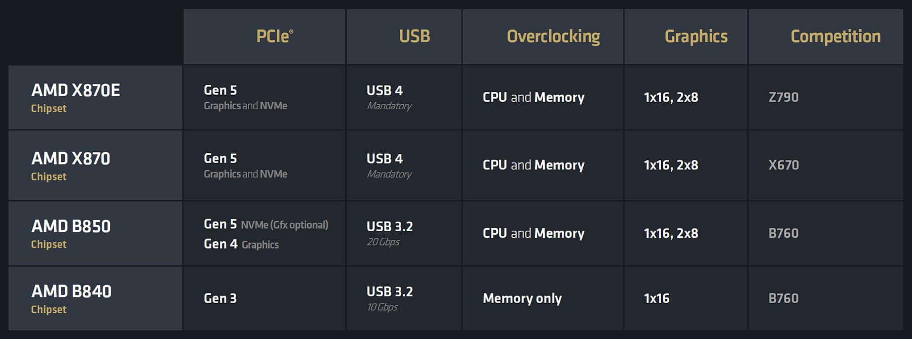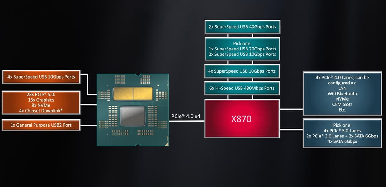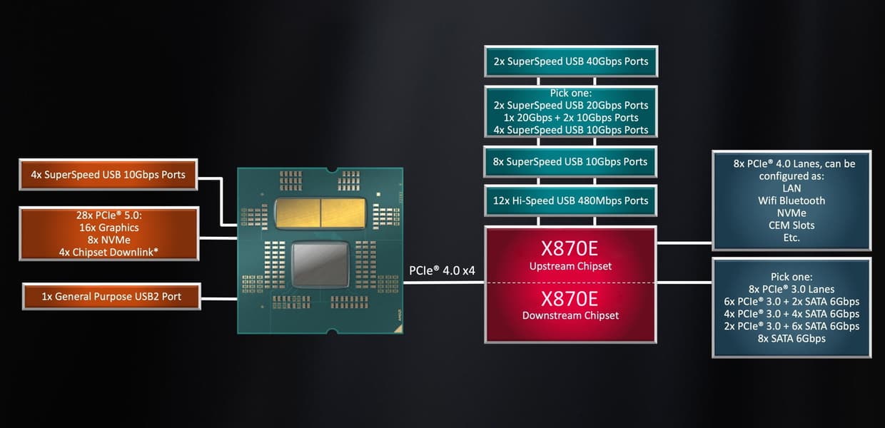 Для системных плат на основе X870E обязательна поддержка интерфейса PCIe 5.0 для слота видеокарты и NVMe-накопителей, подключенных к процессору — как и в случае с предшествующей моделью. Основное отличие моделей на обновленном чипсете — поддержка двух портов USB 4, имеющих скорость до 40 Гбит/с, но она осуществлена при помощи внешнего контроллера ASMedia ASM4242, подключенного по четырем линиям PCIe 4.0, или к чипсету или к CPU — за счет одного из NVMe, а такие решения ранее существовали и на основе чипсетов прошлого поколения, просто теперь такая поддержка стала обязательной. Причем, обязательно именно само наличие контроллера, а производитель платы сам думает, к чему его подключить, к процессору или чипсету. Но фактически чипсет не изменился.