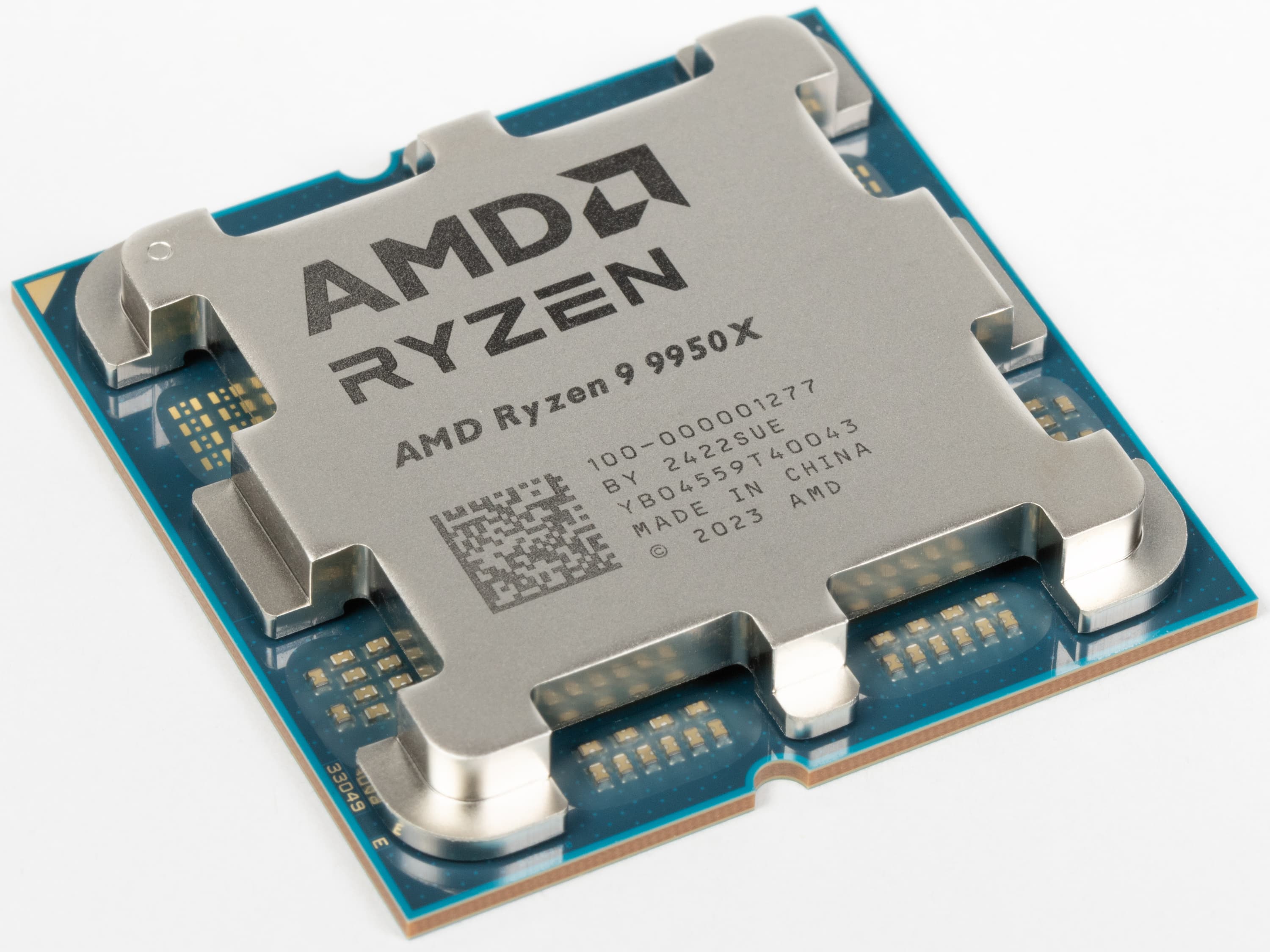 Как и Ryzen 9 9900X, флагман отличается от двух других представленных CPU семейства тем, что использует два активных CCD-чиплета, каждый из которых содержит по восемь ядер Zen 5 и L3-кэш объемом в 32 МБ с общим доступом. Новые кристаллы CCD производятся с использованием 4-нанометрового техпроцесса N4P на тайваньских фабриках TSMC — в отличие от аналогичных чиплетов прошлого поколения, выпускаемых при помощи техпроцесса 5 нм. Благодаря этому новые кристаллы при схожей площади вместили 8,6 млрд. транзисторов — они были усложнены, чтобы повысить производительность Zen 5 при той же частоте. А вот кристалл ввода-вывода IOD у Ryzen 9 9950X ровно такой же, как у всех процессоров Ryzen 7000, он производится по 6-нанометровому техпроцессу и содержит двухканальный контроллер DDR5, встроенное графическое ядро на двух блоках CU архитектуры RDNA 3 и контроллер PCIe 5.0 на 28 линий.